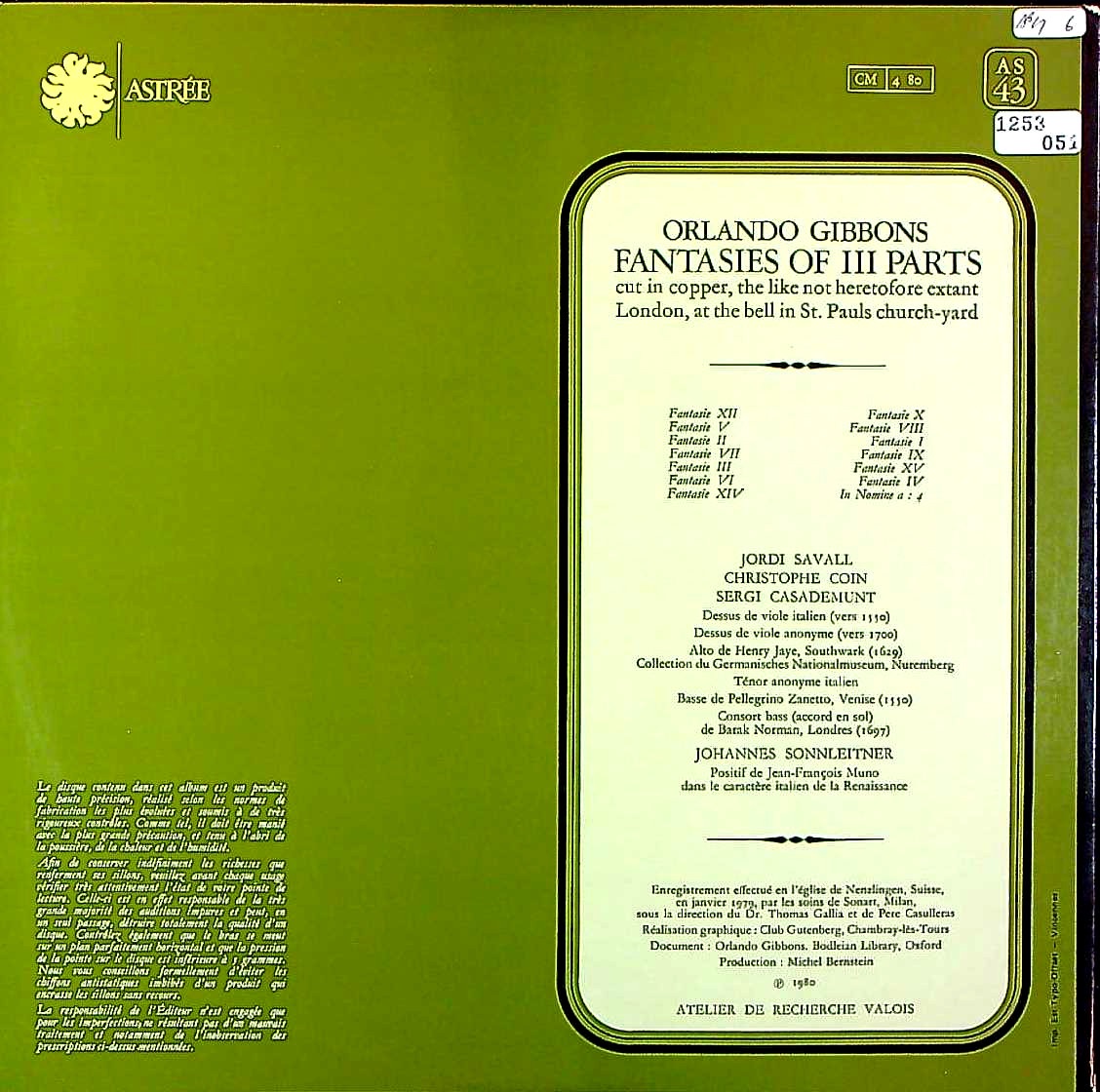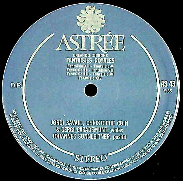 商品コード:1253-051[ASTRÉE] J.サヴァール C.コワン S.カサデムント(ヴィオール) J.ゾンライトナー(ポジティフorg) / ギボンス:3声のファンタジー集(14曲)