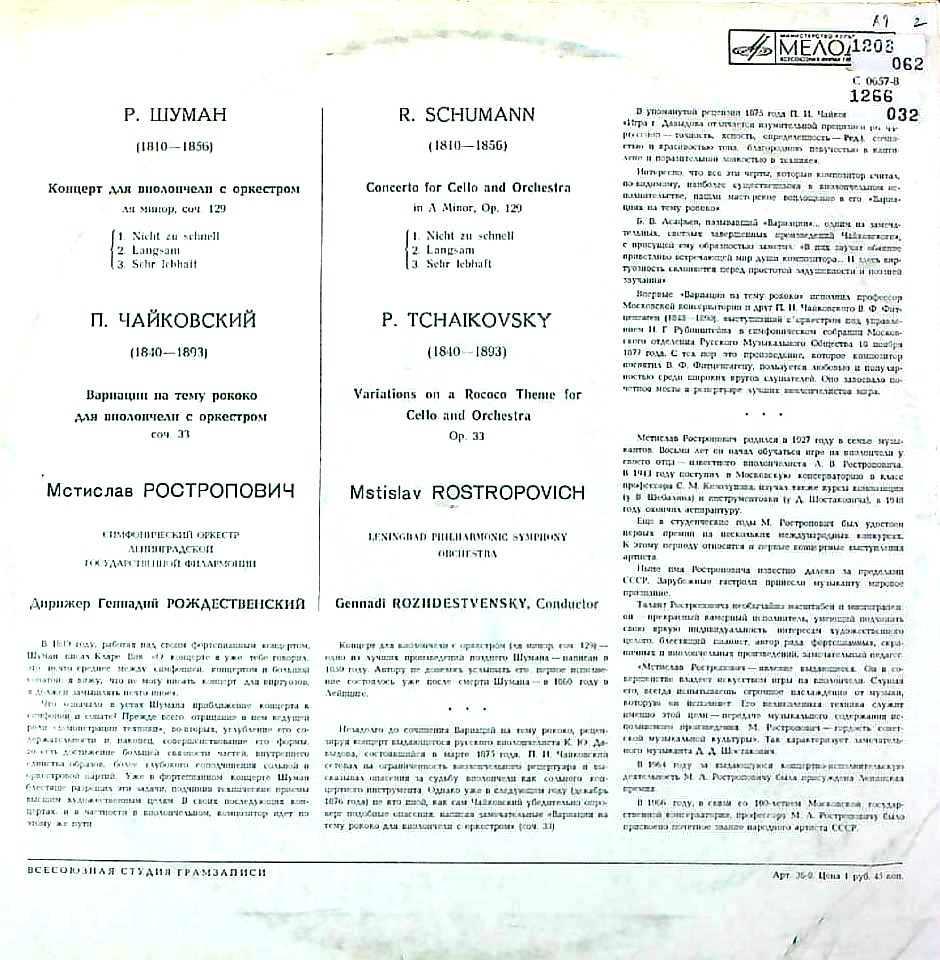 商品コード:1266-032[MELODIYA] M.ロストロポーヴィチ(vc) G.ロジェストヴェンスキー指揮レニングラードpo. / シューマン:Vc協奏曲Op.129, チャイコフスキー:ロココ変奏曲Op.33