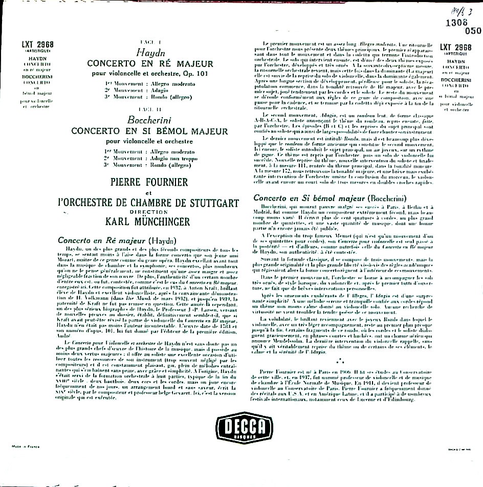 商品コード:1308-050[DECCA] P.フルニエ(vc) K.ミュンヒンガー指揮シュトゥットガルト室内o. / ハイドン:Vc協奏曲2番Op.101, ボッケリーニ:Vc協奏曲9番