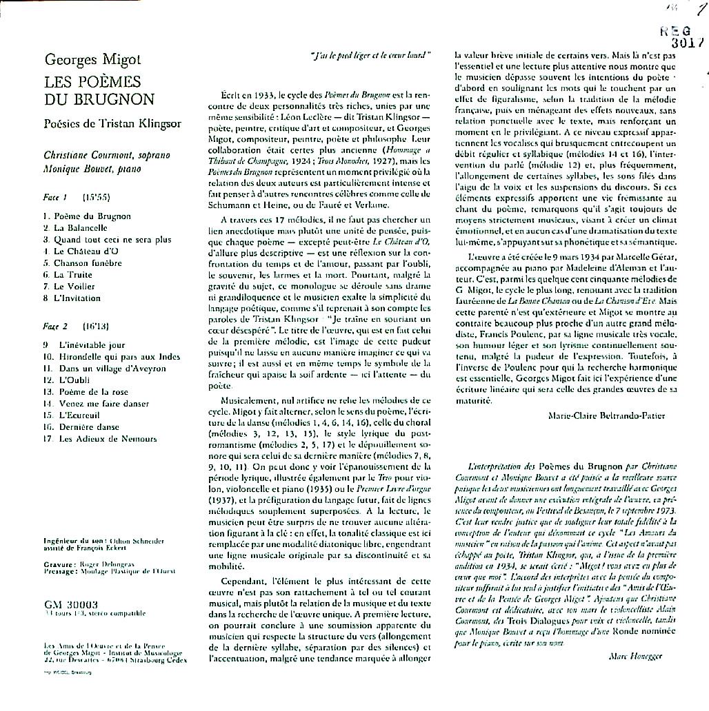 作品名:ミゴー:ブリュニョンの歌, ブランコ, これがすべて終わったら, ドメーヌ・ドー, 弔いの歌, 鱒, ボート, 招待状, 避けられないその日, インドへ行くツバメ, アヴェロンの村で, 忘却, バラの歌, 私を踊らせて, リス, 最後の踊り, ヌムールの別れ (全17曲)
