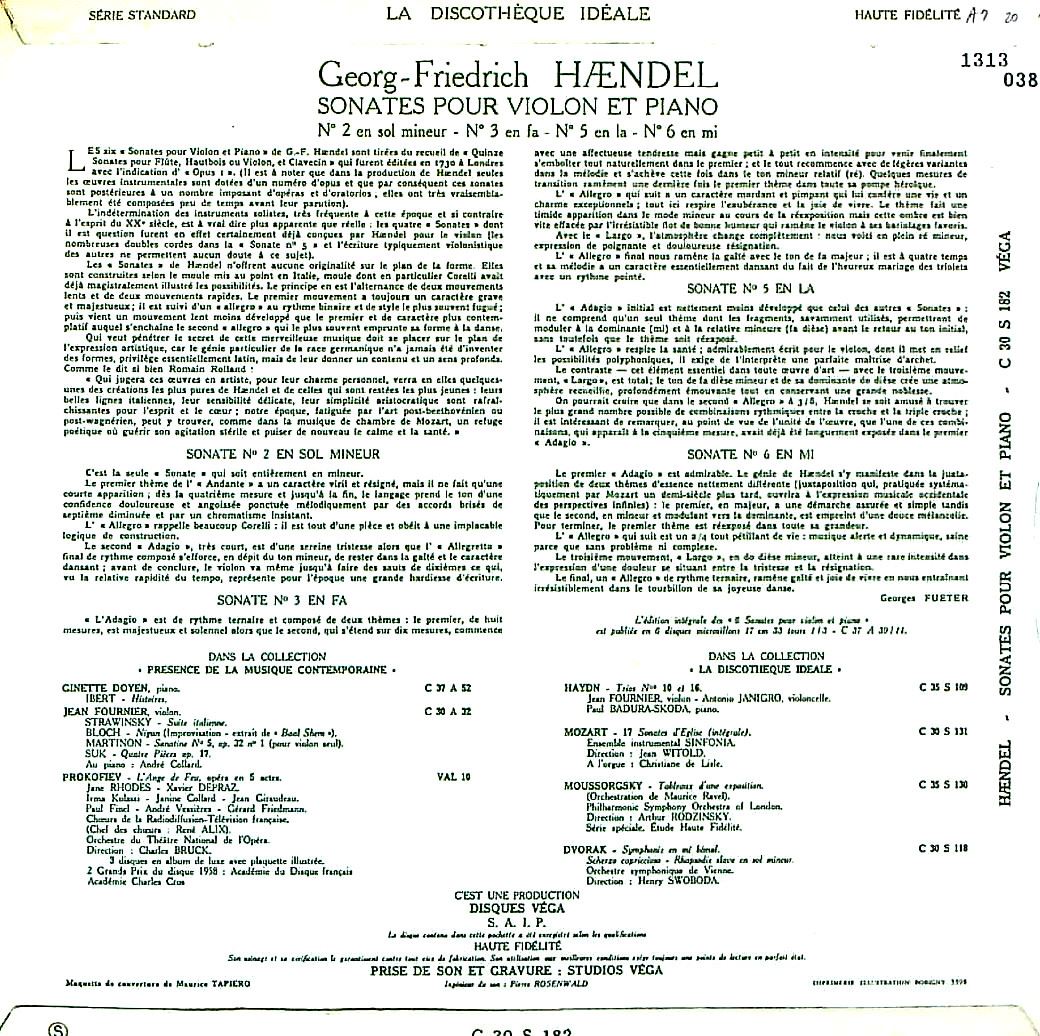 商品詳細:知られざるソナタ録音。もちろんVEGAオリジナル。Op.1から4曲を収録。フランスの生んだヴィルトーゾ2人のデュオ。チェンバロ伴奏が多いこの曲だが、G.ドワイヤンのピアノがまた良い。J.フルニエは、Westminsterでの印象が強いが、ここでのスタイルが本当ではないだろうか。穏やかな表情で、決してきつい音を出さず、静かに曲の内部へ入ってゆき、個を殺し、自身が見たものをそのまま色を付けずに弦に乗せる。これが飽きのこない演奏になる!スーパーレア!! 尚ヘンデルのVnソナタは時期により考え方が異なる。現在ではヘンデルのVnソナタはOp.1の中の6曲で順番にOp1-3/10/12/13/14/15となる。これはクリュザンダー版(1879年)の作品1の通りである。Op.1は全部で15曲あり、これら6曲以外はVnソナタではない。録音当時のVÉGAもこれに従っていると思われる。クリュザンダー版のOp.1に含まれないVnソナタも4曲存在するのでそれらが混同されていないか見る必要がある。VÉGAのJ.フルニエ(vn)/G.ドワイヤン(pf)の録音は込み入っており、1950年代にリリースされたC30S 182(当盤)には2/3/5/6番の4曲が収録されている。1960年代に出た30MT 10180には1/2/3/4番の4曲が収録されており、オリジナル/再版の関係ではない。また別に7"が今のところ3枚確認されており、ソナタ1番:C37A 39/ソナタ2番:C37A 40/ソナタ6番:C37A 44である。ここで6曲は2枚ある12"の何方かに必ず含まれることを確認した。但し2・3番の2曲は両方に含まれるので30MT 10180は再版ということになるが1/4番はC30S 182には含まれず、3/4番のも7"が存在するか不明。そうなるとこの場合、12"は2枚ともオリジナルということになる。12"では2枚ないと全6曲揃えることが出来ない。1950年代初期からWESTMINSTERでフランスから参加して多くの名演といえる録音を残した夫婦デュオのヘンデルは珍しくもあり、音楽性の高さは群を抜くものがある。ジャン・フルニエの程好くヴィブラートがかかり抑えた表情で聴くヘンデルもまた絶品である。30MT 10180をお持ちの方に紹介したい。このC30S 182がないと5/6番が漏れてしまうので注意!