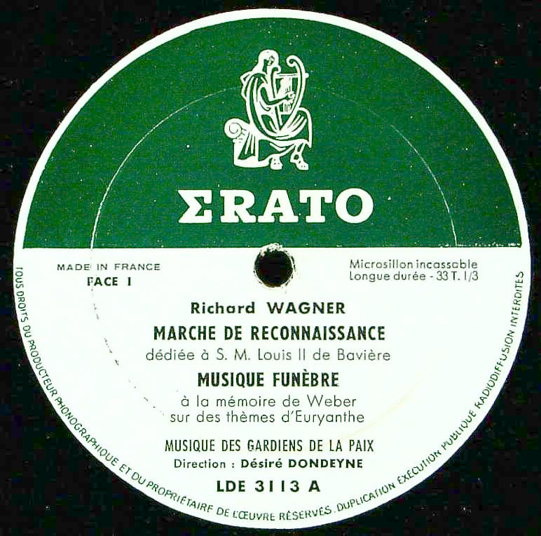 商品詳細:D.ドンデーヌ指揮パリ警察音楽隊といえばベルリオーズ:葬送と勝利の交響曲の録音で知られるフランス随一の軍楽オーケストラである。ここではやはりワーグナーとメンデルスゾーンが作曲した軍楽作品の計4曲が収録されている。殆ど演奏されることのない曲であり、LPではこれが初の録音かもしれない。DECCAも盛んに軍楽オーケストラのLPを発売したが、フランスではERATOが積極的であった。とはいってもD.ドンデーヌ指揮パリ警察音楽隊の録音はERATOに全部で3点ほどである。DECCAからも発売されたようである。通常のクラシック音楽と異なり、警察組織にある軍楽オーケストラ以外で演奏されることはない特殊作品。しかしこのような作品をワーグナーもメンデルスゾーンも書いていたとは驚きである。ワーグナーの曲は一瞬でワーグナー作品とわかる雰囲気を持っている。通常の管弦楽団が演奏しても全く違和感のない曲である。メンデルスゾーンの曲も静かに始まる管弦楽曲で、こちらも通常の管弦楽曲の扱いでおかしくない曲である。それでも軍楽オーケストラ以外では演奏されない点からも特別なジャンルとしての扱いの対象なのだろう。このLPは敢えて軍楽オーケストラのための作品集とはせずに、あまり取り上げられない「管弦楽曲集」という扱いで全く問題がないほど、通常のクラシック音源である。演奏が軍楽オーケストラというだけで、演奏は全く軍隊風な所は感じられない。珍しいワーグナーとメンデルスゾーンの「管弦楽曲集」と思っていただいて問題ない。全体に静かな音楽であり、決してうるさい演奏ではない。ステレオ:STE 50016もあるが入荷はない。