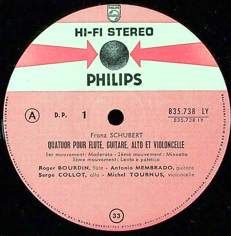 商品コード:1330-047[PHILIPS] A.メンブラド(gt) R.ブルダン(fl) フランス弦楽トリオ / シューベルト:Gt四重奏曲, Vn・Gt・Vcのための8つのメヌエット