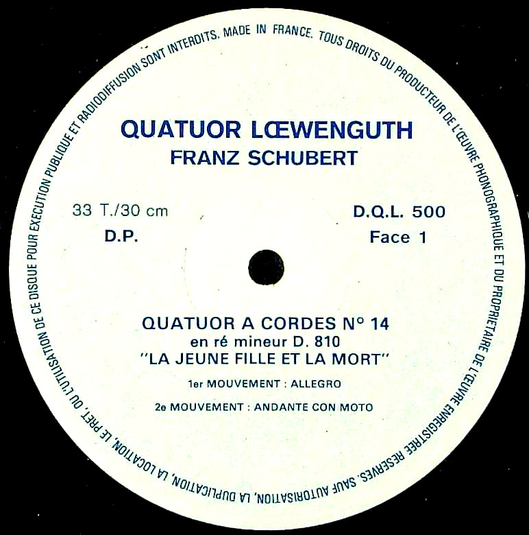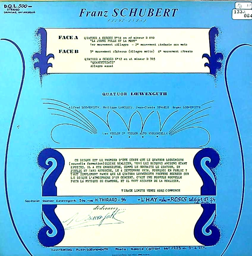 商品詳細:レーヴェングートQt.によるシューベルト:SQ14番「死と乙女」、12番「四重奏断章」。2楽章に歌曲「死と乙女」のPf伴奏部を借用した為、同名の副題が付いたこの曲は、作曲者が健康を害した直後に書かれた。全楽章短調で書かれているが最終部に長調になり、静かに終わりを迎える。死への恐怖・絶望と平安を聴くようである。レーヴェングートQt.は'50年代に同曲をDFに録音しているが、それに負けず劣らずの素晴らしい演奏。是非両録音聴いていただきたい。この録音は1978年パリと思われる。1983年リーダーのアルフレッド・レーヴェングートが亡くなり、未亡人アラン・レーヴェングートが保有する音源から限定版として1983年にプライベート・レーベルであるQuatuor Loewenguthから数点発売された中の最初の1枚と思われる。未発売音源の初リリースLPである。非常に希少!流石にフランスでもトップランクにいたレーヴェングートQt.の演奏は1970年になっても次元が異なる!