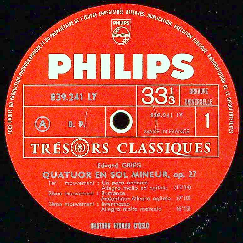 商品コード:1333-053[PHILIPS] オスロ・ヒンダーQt. / グリーグ:弦楽四重奏曲 ト短調 1番, ヘ長調(1892)