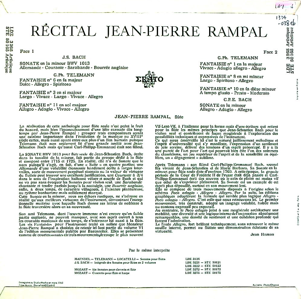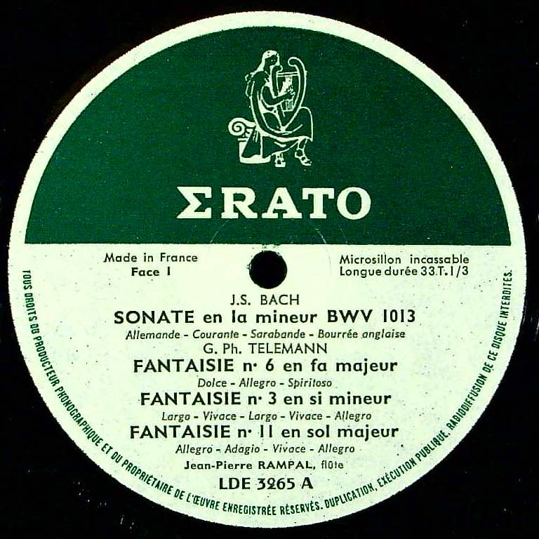 レーベルタイプ:【フランスでのモノラル・オリジナル】---緑/白竪琴2重内溝, 外周3.5cmの盛上りあり(カマボコ), 9時にMede in France(横黒文字), 3時にMicrosillon Invassable Longue durée 33T. 1/3, グルーヴガード厚手, 表記されたレコード番号:LDE 3265, Price Code:なし, Rights Society:記載なし, スタンパー/マトリクス:LPL 2718 ERA 3265 A/LPL 2719 ERA 3265 B (ラウンド小文字スタンパー・ERATO/仏PHILIPSタイプ), ERATO録音ステレオ製造を示すERA STEとレコード番号を含む専用マトリクス使用, 補助マトリクス:A2/A2, 再補助マトリクス:なし, Pathéプレスではない, 1960年代スタンパーによる1963年頃製造分, 緑/白竪琴外溝レーベル存在せず, 緑/白竪琴2重内溝レーベルのモノラル最初期分, これより古いモノラル・レーベル存在せず, モノラル最古レーベル・最厚プレスである, 更に古いマトリクス存在せず(A/Bが最古), ステレオ存在する, RIAAカーヴである, ERATO音源のERATO製作仏PHILIPSプレス, カッティングマスター:380はないがC.I.D.I.S. Louviersの技師と思われる, 工場:Société Phonographique Philips, モノラル・オリジナル, original for mono