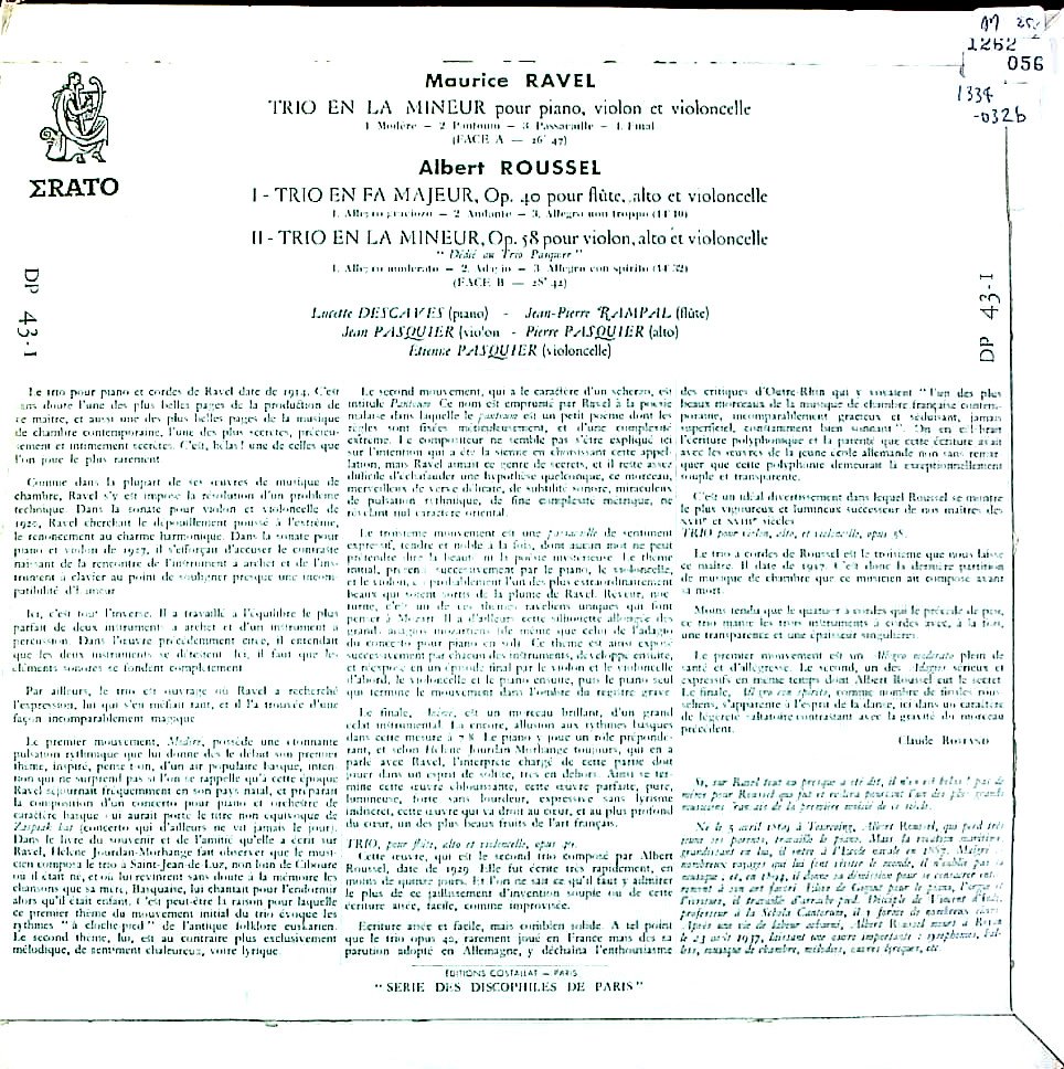 商品コード:1334-032b[ERATO] L.デカーヴ(pf) J.P.ランパル(fl) パスキエ・トリオ / ラヴェル:Pfトリオ, ルーセル:Fl・Va・Vcトリオ 他