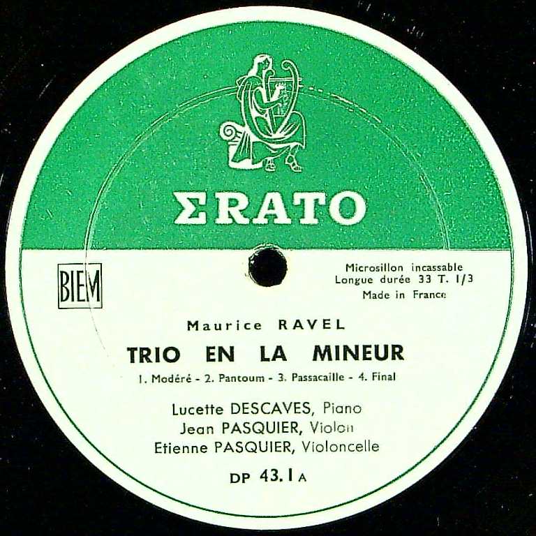 商品詳細:印象主義の代表、ラヴェル。それまでの機能和声では聴く事の出来なかった響きと、色彩の豊かさが特徴。演奏は当時フランスを代表する演奏家、L.デカーヴ、J.P.ランパル、パスキエ・トリオ。LP愛好家にとっては非常に有名な盤だが、実際に目にできる機会は非常に少ない。ラヴェルは勿論だがB面のルーセルも素晴らしい。フランスのエスプリを感じていただきたい。世界的に人気が高く、高額なことでも知られる。デカーヴのピアノが聴ける盤!リュセット・デカーヴは1906年、フランスの作家ルシアン・デカーヴの弟、ウジェーヌの娘としてパリに生まれた。リュセットの名付け親はサン=サーンスらしい。パリ音楽院でマルグリット・ロンとイヴ・ナットに師事し、1923年にプルミエ・プリを受賞して卒業。1932年にはプロコフィエフの指導の下、彼のピアノ協奏曲第3番のパリ初演を行った。1942年にはパリ音楽院の教授に就任、教育者として名を成した。SP録音が多数ある。ブイヨンSQと共演したフランクのピアノ五重奏曲が有名。ラヴェルのトリオはLPで聴くことのできる最良の演奏と昔から評価が高い。録音年がはっきりしないがERATOがまだLDEシリーズをスタートさせる前のDPシリーズのCollection de club discophiles de parisとレーベルに記載していた1950年初頭のモノラル録音と思われる。スタンパーなどはLes Discophiles Françaisとそっくり。当番号の初出盤である青白にSerie des Discophiles de Parid印刷の特殊レーベルは1953年の第1回刷りのみ存在の超希少レーベル!滅多に見ることはない!恐らく関係者だけに配布されたものではないかと思われる。したがって通常の商用レーベルは濃緑白竪琴内溝レーベルが最初とみてよいと思われるが、実際の初出をなかったことにはできないので【フランスでの第2版(最古の商用レーベルと思われる)】--とした。