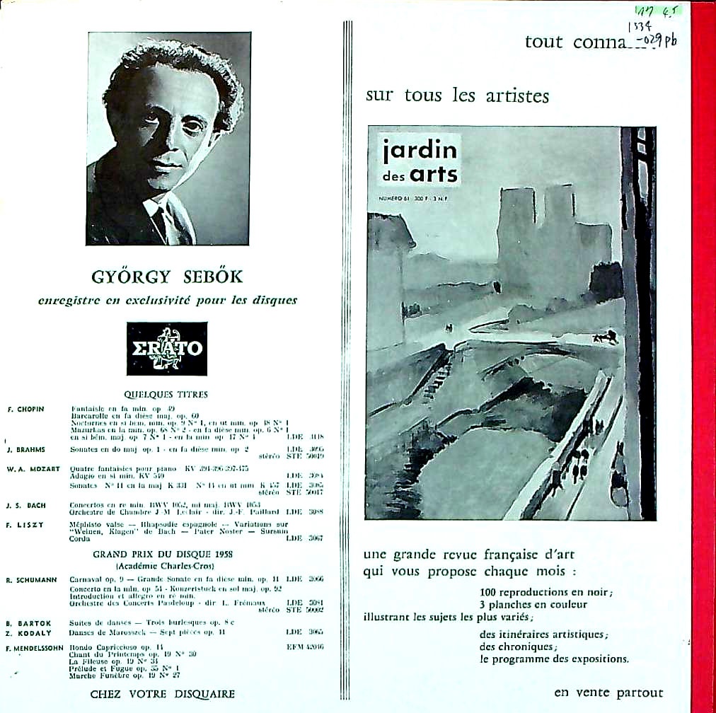 商品詳細:ジェルジ・シェベーク(1922- 1999)、ハンガリーはセゲドの生まれ。11歳でソロ・リサイタルを開き、14歳でベートーヴェンのピアノ協奏曲第1番をフリッチャイ・フェレンツと共演するなど、神童振りを発揮した。16歳のときにリスト・フェエンツ音楽大学に入学してコダーイ・ゾルターンやヴェイネル・レオーらの薫陶を受け、卒業後は欧米やロシアなどで演奏活動を始め、ヤーノシュ・シュタルケルらとも度々共演を重ねた。1949年からはブダペストのバルトーク・ベーラ音楽高等学校のピアノ科教諭に就任するも、1956年のハンガリー動乱の影響でパリに亡命を余儀なくされた。この時シュタルケルの援助によってブルーミントンのインディアナ大学の教授となった。また、ベルリン高等音楽院や桐朋学園大学などにも招かれてマスター・クラスを開き、後進の指導に熱心に当たった。欧州ではERATOとPHILIPSを中心に非常に多くの録音を残すも、その大半が室内楽である。ヤーノシュ、グリュミオーらが好んでシェベークの伴奏を希望するようである。それでもERATOではソロ録音が多い。その中でブラームスのソロはさほど多くない。この他にはPfソナタ1/2番がある程度。彼のピアノは一見地味ではあるが、正攻法に弾いた味わい深さが並外れており、特にプロの音楽家に好まれている。シュタルケルがDECCA以外では彼としかデュオを組まなかった理由はよく聴いてみれば分かるような気がする。Jardin Des Artsシリーズは全てモノラル/ステレオ発売と思われる。またレーベルにはLDE番号とEJA番号の2つがある。ジャケットはEJA番号のみ。