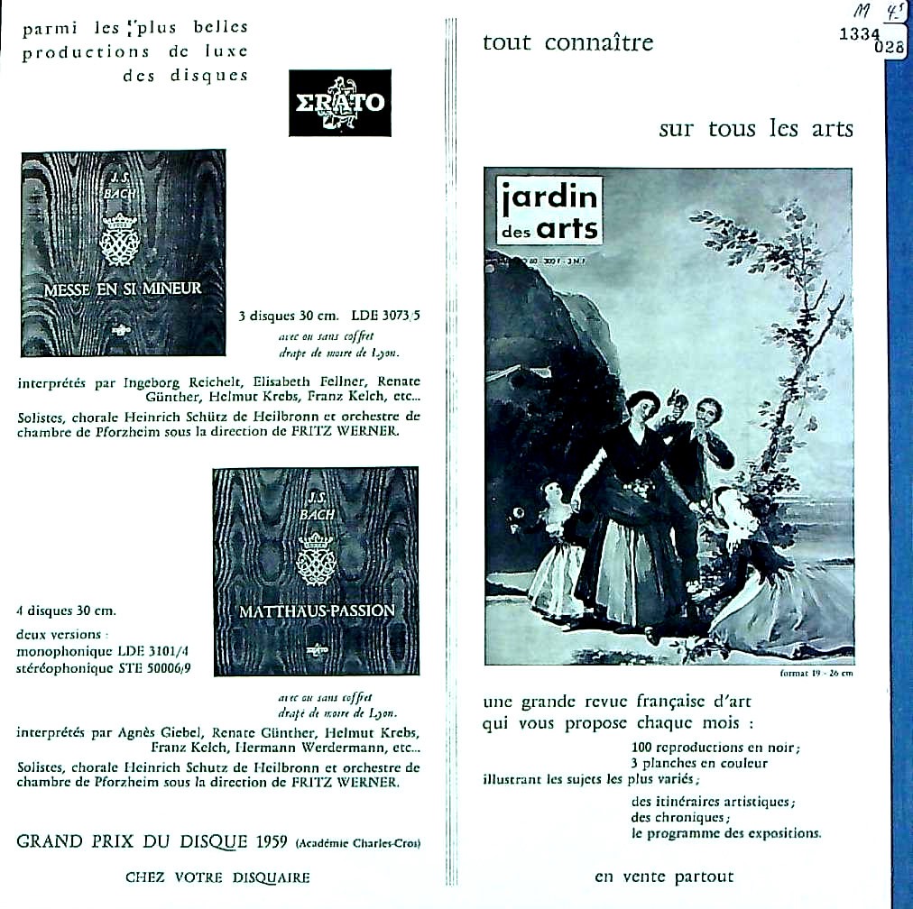 商品詳細:Jardin Des Artsシリーズ第1号。1959年A.シャルランの手により録音、限定3000部のみ製作。三方開きジャケにリブレットが綴じ込まれた豪華なシリーズ。古いフランス音楽をジャン・フランソワ・パイヤール室内o.が演奏。ERATOの最も得手とする分野。ソロVnはH.フェルナンデス、写真があり非常に綺麗な女性奏者。バロック作品に力を発揮するパイヤールの流れるような音楽が、いかにも良きフランスを感じさせる。1959年のシャルル・クロ・ディスク大賞を受賞。ヴァイオリンのユゲット・フェルナンデスの生まれは年は不明だがスぺインにルーツを持つ家系のフランス生まれと思われる。1950年代中期にはERATOのモノラル録音があり、早い段階でERATOのバロック作品に無くてはならないヴァイオリン奏者となった。世のヴァイオリン奏者はまだまだSP時代のロマンチックなスタイルを継承しており、ヴィブラートをタップリ聴かせた演奏を人々も求めていた。そんな時代に突然ノン・ヴィブラートでクールに弾くスタイルのフェルナンデスが現れた。ERATOはバロックに力も入れ始めた矢先であり、フェルナンデスのスタイルはこれからERATOが目指そうとした世界感とピッタリ一致したのだろう、当時全く無名の女性奏者を抜擢した。指揮のパイヤールも同じ考えだったに違いない。そこでERATOの目指すスタイルに人選が合致し、両者は度々録音を行っている。また1959年にスタートしたJardin Des Artsシリーズ(Garden of Artsシリーズ)の第1号に起用された。このシリーズは豪華シリーズで通常盤より高額な単価だったと思われる。これがその記念すべき第1号である。後にタリアフェロ、シュタルケルなどの人気盤も録音される。最初の数枚は間違いなくアンドレ・シャルラン事務所による録音である。Jardin Des Artsシリーズには全てモノラル/ステレオ発売と思われる。またレーベルにはLDE番号とEJA番号の2つがある。ジャケットはEJA番号のみ。