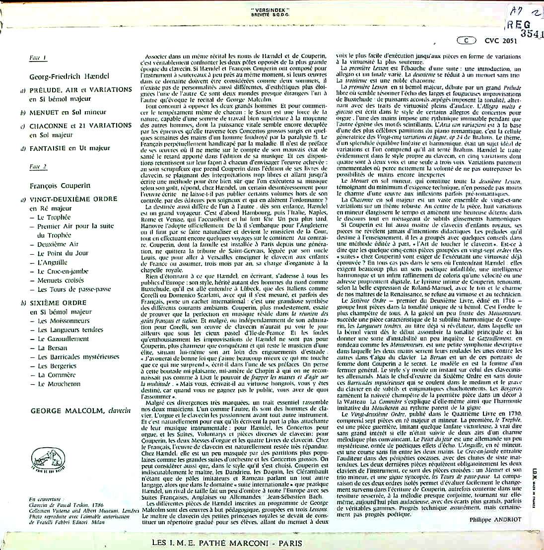 商品コード:REG-3541[仏VSM] G.マルコム(cemb) / F.クープラン:クラヴサン曲集第2巻第6組曲, 第4巻第22組曲, ヘンデル:前奏曲・エアと変奏 他