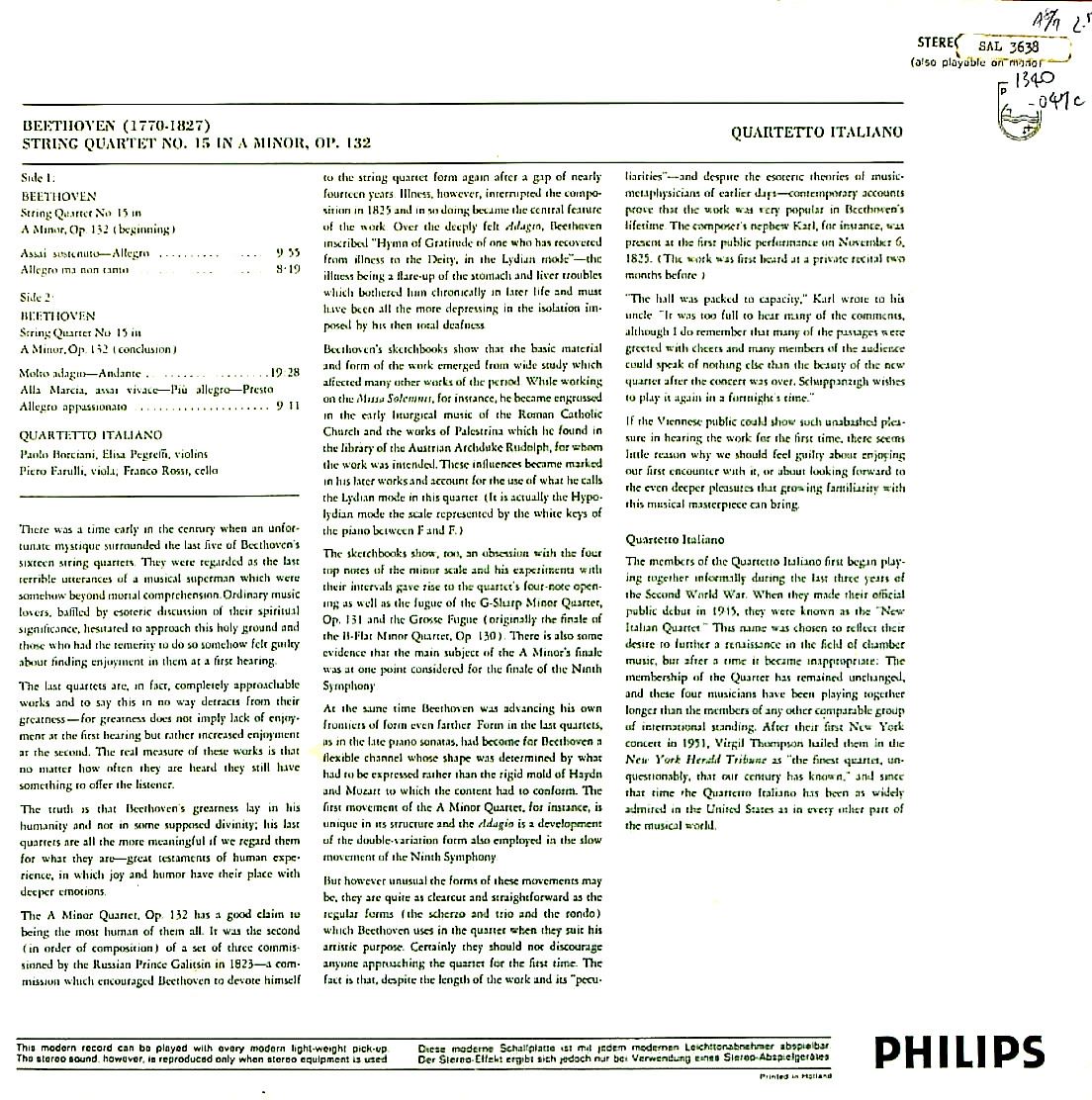 商品コード:1340-047c[PHILIPS] イタリアQt. / ベートーヴェン:弦楽四重奏曲15番