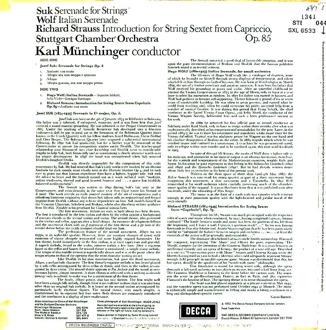 商品コード:1341-044[DECCA] K.ミュンヒンガー指揮/ スーク:弦楽セレナーデ, ヴォルフ, R.シュトラウス