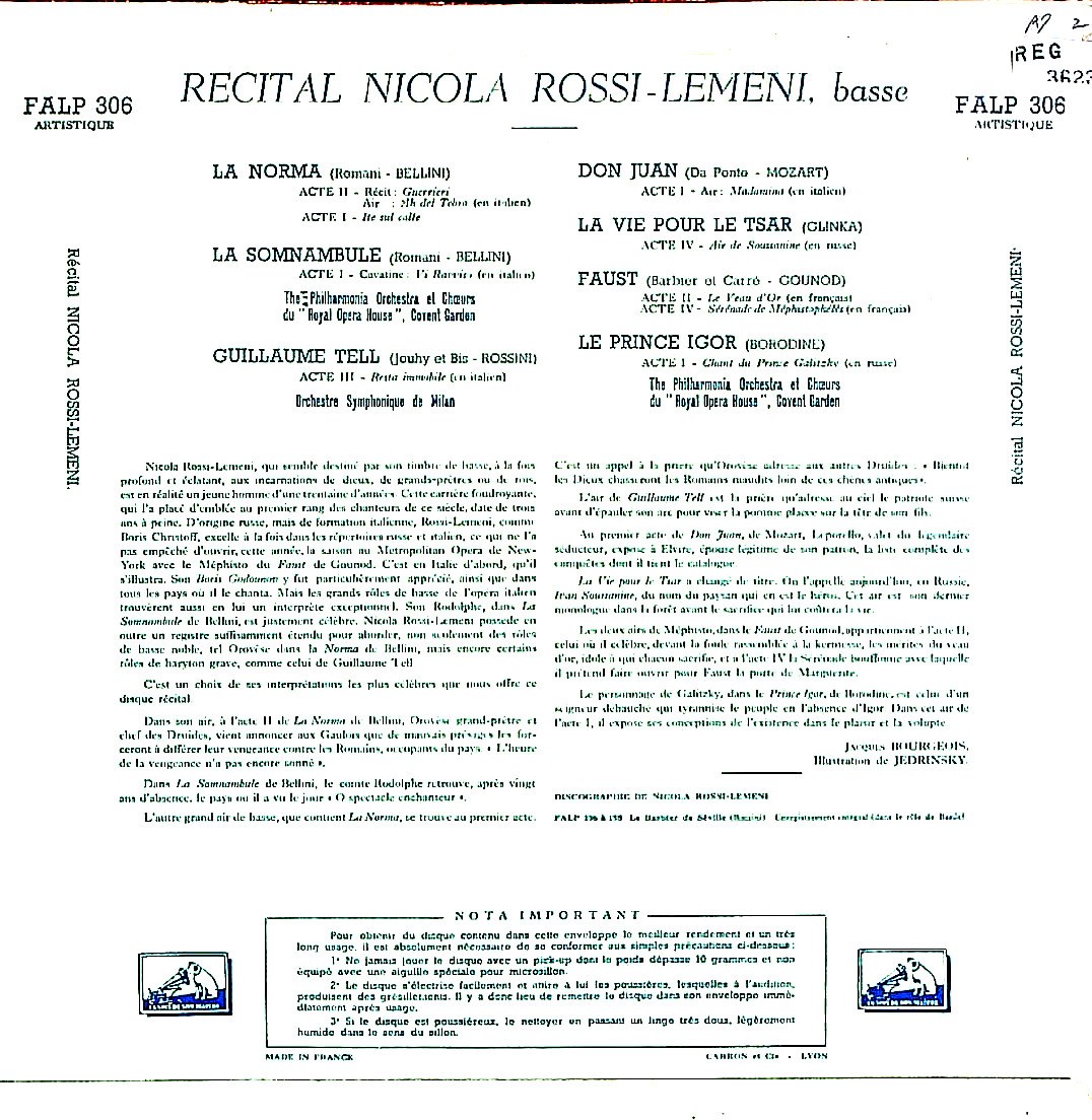 演奏者:N.ロッシ・レメーニ(bs)指揮者不明ミラノso./コヴェント・ガーデンo./フィルハーモニアcho.