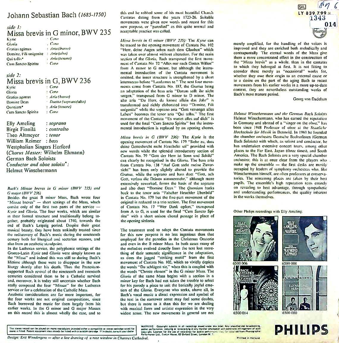 商品コード:1343-014[PHILIPS] H.ヴィンシャマン指揮 E.アーメリング(s)/ バッハ:ミサ・ブレヴィス3, 4番BWV233, 234