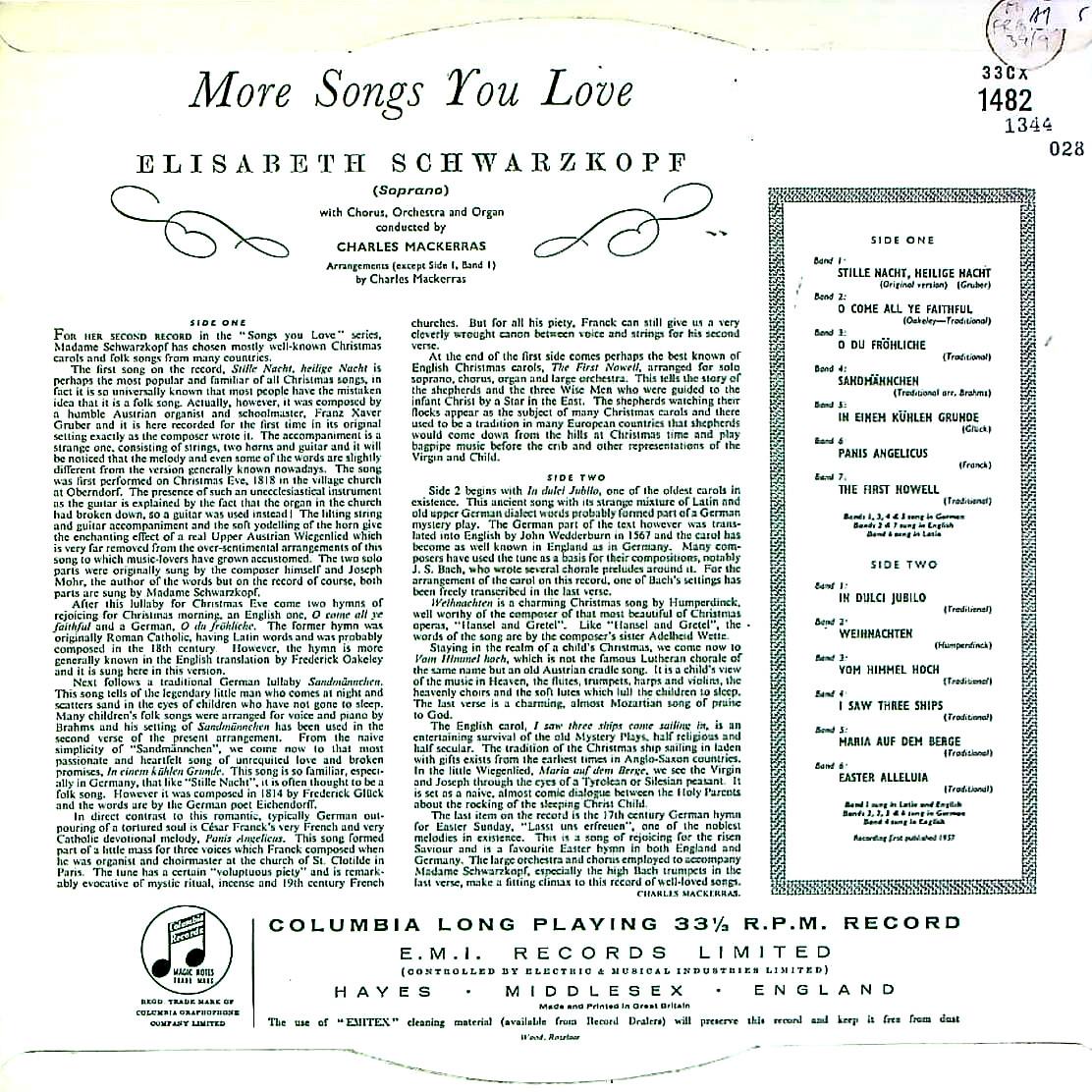 商品詳細:シュヴァルツコップのLPでも、これは結構なレア盤。マッケラスの指揮というのも珍しい。「More Songs You Love」と題されているように、「Songs You Love」:33CX 1404/SAX 2265の続編という形を取っているが、内容は全く異なり、こちらはオーケストラ付きのクリスマス曲集(13曲)という内容。ピアノ伴奏の歌曲集だったSongs You Loveとは何の関連もない。A面に針を落とすと、オーケストラをバックに「きよしこの夜」から始まる。有名な歌手なら一度は企画されるもの。合唱も入り、Orgも伴って、クリスマス気分たっぷりに歌い上げる彼女の特別な魅力がいっぱい。1957年5月/6月ロンドンでモノラル録音され、1957年末にモノラル盤が33CX 1482で発売された。Songs You Loveにはステレオもあったが続編がモノラルだけというのは何とも不思議な発売である。但し1979年になってHis Master's Voice:ASD 3798でステレオ発売されたが22年後の事である。このような発売のされ方は1950年代録音には時にある。3チャンネル録音はしたが、発売はモノラルだけであったという事だろう。いかにステレオが出されたとしても1979年発売を初期盤とは言い難いのである。当時はモノラルのみの発売で良しとした意図を尊重すべきだろう。内容は大手レーベルが大物歌手にオファーするクリスマス曲集である。大物に相応しくオーケストラと合唱団付きである。EMIに限らず他のレーベルでも出されているが1957年発売は相当に古い時代といえる。普段クラシックLPを購入しない層にもアピールしたEMIの販売戦力の一つではあるが内容が良ければ全て良しという事だろう。尚オーケストラ・アレンジは、チャールズ・マッケラス自身によるもの。またギターの名手ブリームもゲスト参加している。指揮者のチャールズ・マッケラスはまだ活動を始めたばかりで仕事をもらって意気揚々と張り切ったというところ。フランス盤のタイトルは「永遠のメロディ-2」。