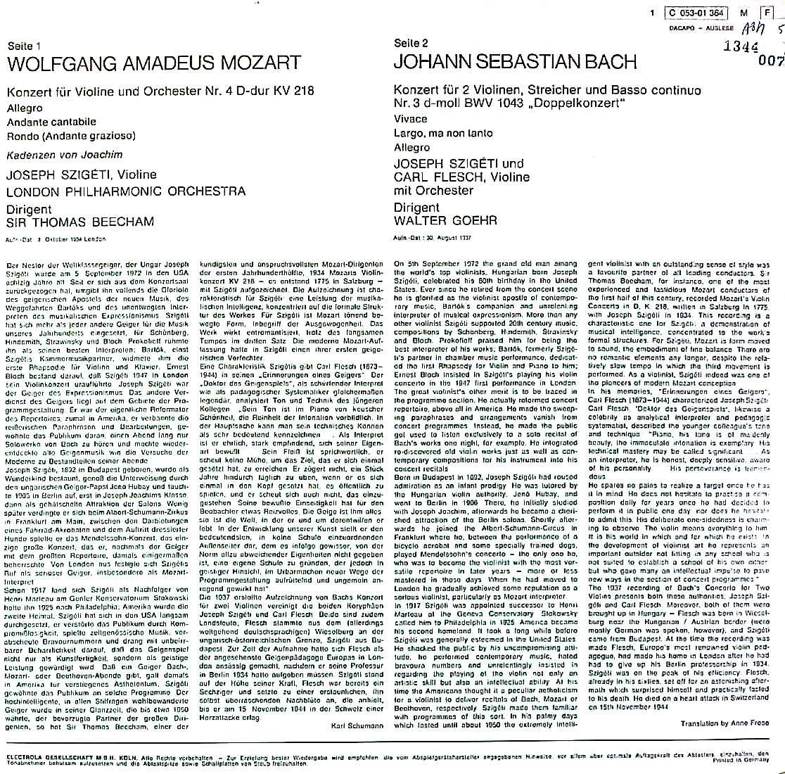 商品コード:1344-007[ELECTROLA] J.シゲティ, C.フレッシュ(vn)/ モーツァルト:Vn協奏曲4番, バッハ:2Vn協奏曲