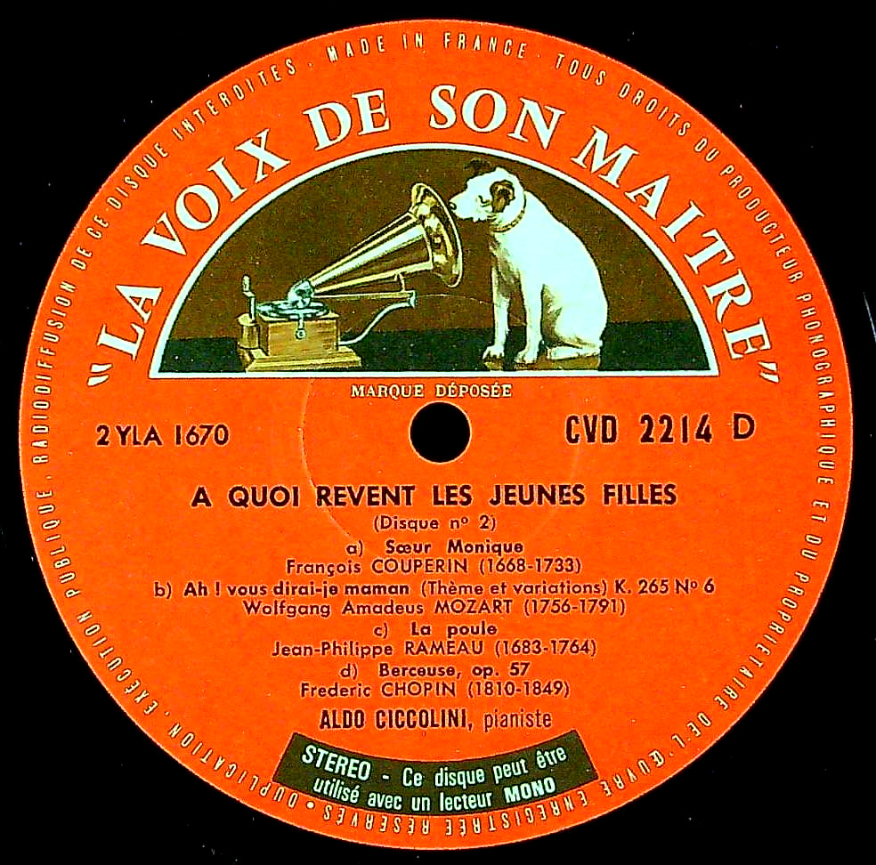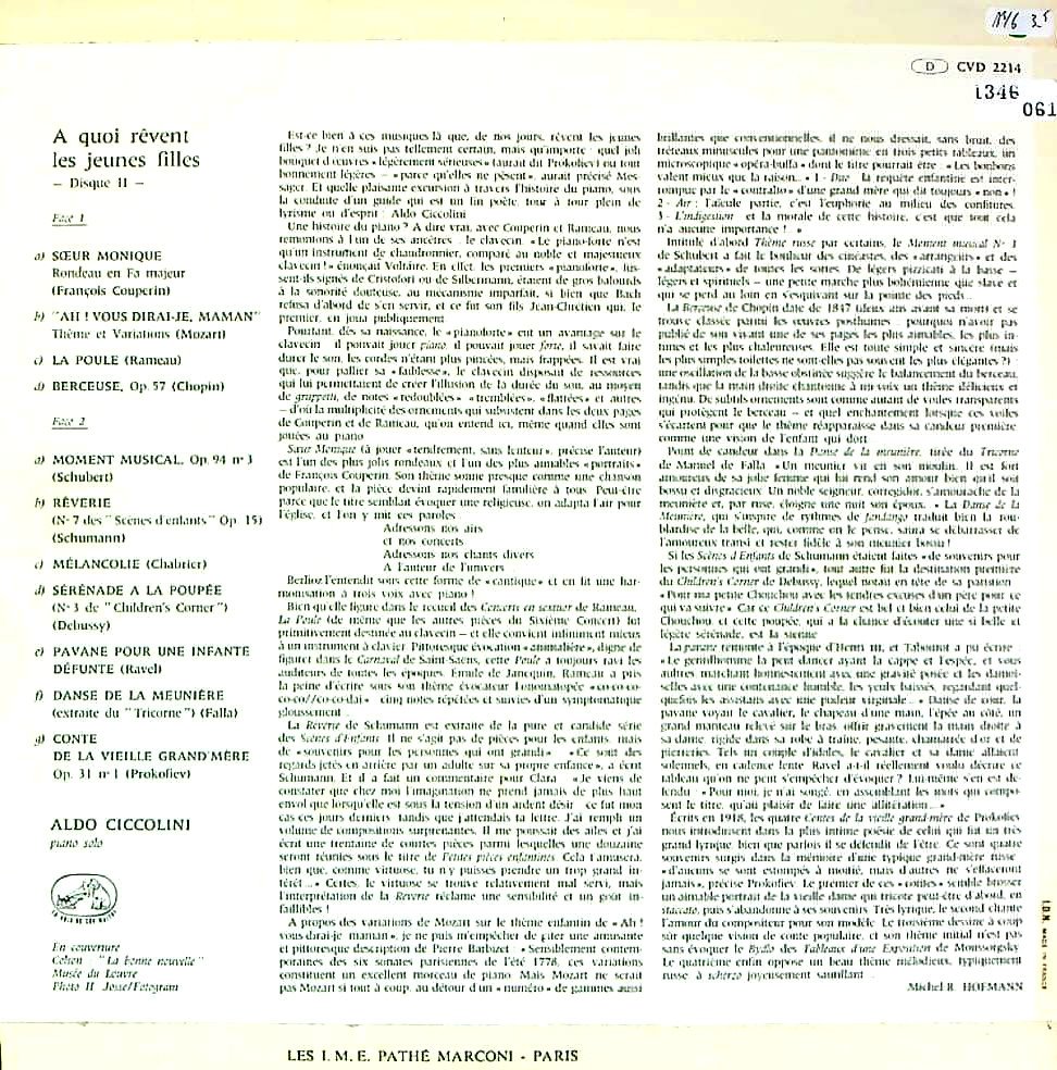 商品詳細:全11曲のピアノ小品集のVol.2。この録音の前、チッコリーニはVol.1をモノ/ステレオで入れていたが、このVol.2はステレオのみ。明るく爽やかな仕上がりで、万人に愛される小品集だろう。選曲はトロイメライ、パヴァーヌ、楽興の時、子守歌等、親しめるものが多い。一曲一曲が誠心誠意、丁寧に弾かれ、並の小品集にとどまらない入魂の一枚だ。そのくせ毎日でも聴きたくなる親しみがある。まさに名盤!Vol.1をお持ちの方に是非!素晴らしいピアノ小品集!大推薦!Vol.1には仏COLUMBIAレーベルの旧番号が存在するがVol.2はLa Voix De Son MaîtreのCVD 2214が初出となる。その中でも白SCニッパー中ステレオレーベルが最初だが滅多にない。市場の大半がカラー切手ニッパーレーベルである。