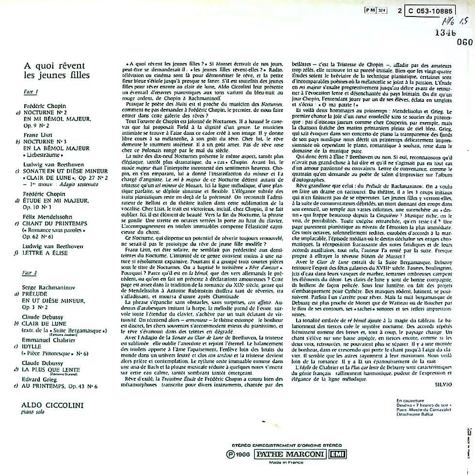 商品詳細:イタリアの生んだ名ピアニスト、チッコリーニはその膨大な録音の中で小品集を2点残した。これはその最初の一枚(FCX 30542/SAXF 130542が初出番号)で、Vol.1のロゴはない。当時Vol.2を制作する予定は無かったのだろう。Vol.1のタイトルである「A Quoi Rêvent Les Jeunes Filles」は直訳すると「若い女の子は何を夢見ていますか?」。しかし同名タイトルの曲はここには存在しない。全11曲入りの粋な小品集である。これはその再版だが充分音は良く、購入後も大切なピアノ・レコードとして保管できるはず。全11曲、選曲も良く、心憎いほどの洒落っ気を持った演奏であり、手抜きの一切無い宝石を散りばめたような演奏。大家ほど小品を録音しない。実力が明らかになってしまうからで、プレッシャーがあるのだろう。彼の自然体の演奏は生涯の友となるはず!Vol.2も欲しくなるに違いない。再版でも十分に楽しめる素晴らしい小品集!