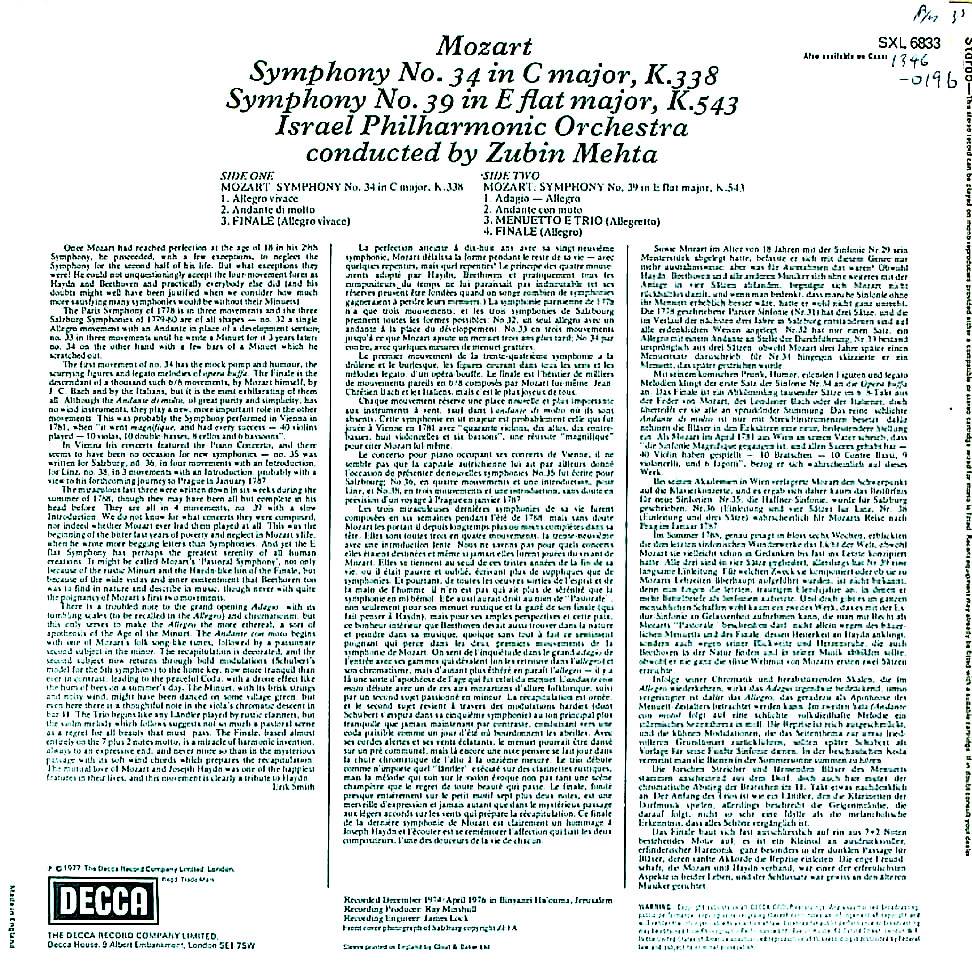 商品コード:1346-019b[DECCA] Z.メータ指揮/ モーツァルト:交響曲34, 39番K.338, 543