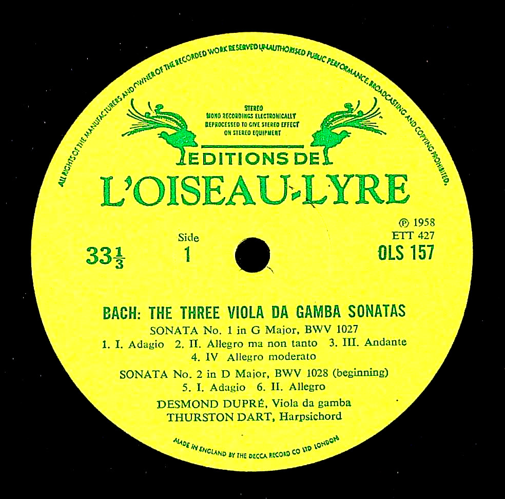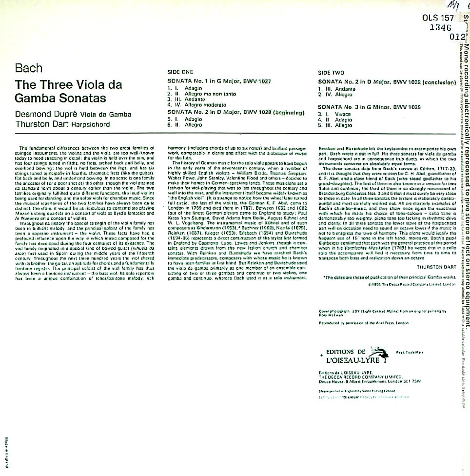 商品コード:1346-012[L'OISEAU LYRE] D.デュプレ(gamb)/ バッハ:3つのGambソナタ(全3曲)