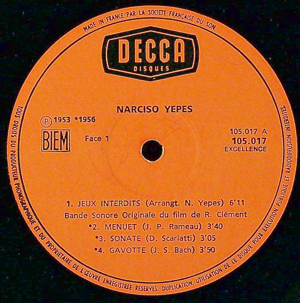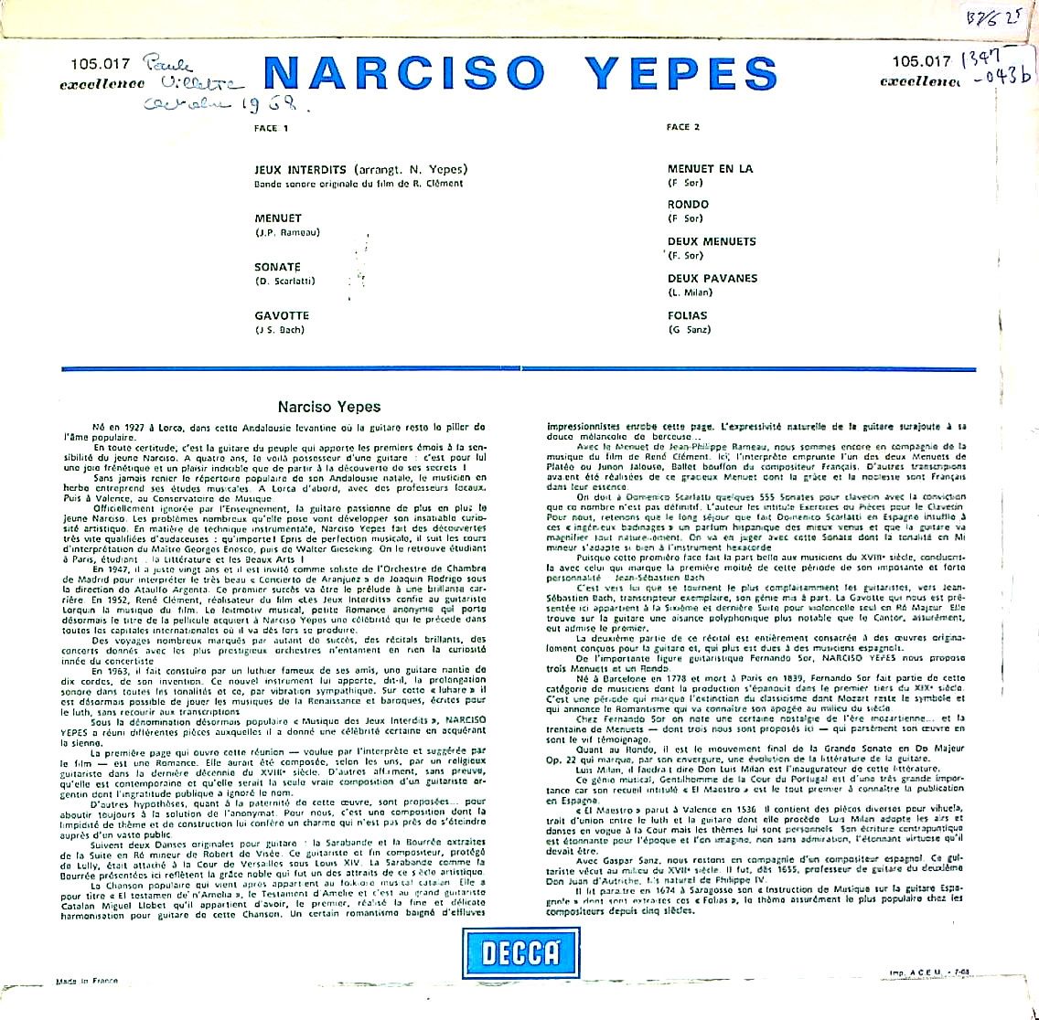 商品詳細:7"にもシングルカットされているルネ・クレマン監督の映画「禁じられた遊び」の主題歌としてイエペスの名を世界に知らしめたJeux interditsを含むギター作品9曲。バッハはB.1011(無伴奏Vc組曲5番)からガボット。イエペスはその後DGGに移籍してしまうのでDECCAモノ録音は極めて少なくこれが彼のベストだろう。リュートにも取り組み各方面で活躍を見るが、ギタリストとしての出発点である。このDECCA盤にイエペスの本気を見る。仏モノラルのみの発売と思われる。スペインのギタリスト、ナルシソ・イエペス(1927~1997)はスペイン・ムルシア地方、ロルカの生まれ。イエペスは4歳の頃からギターを持ち、少年時代にはスペインのバレンシア市の音楽院に入学してギターの天才と呼よばれた。マドリード音楽院では、レヒーノ・サインス・デ・ラ・マーサにギターを師事した。こんにちの10弦ギターを開発したことでも知られている。そしてイエペスの名を決定的なものにしたのは、映画「禁じられた遊び」の主題曲の演奏であった。この曲は今でも「スペイン民謡」ということになっているが、イエペスがスペインの古い民謡に手を加えて、ギター音楽として編曲したものと見られている。美しく哀愁を帯びた旋律は、ギターの魅力を十分に生かしたものである。今や世界中で最も親しまれているギター作品の一つとなっている。曲の「禁じられた遊び」は日本では映画「禁じられた遊び」がリバイバルで上映された、昭和37年(1962年)にヒットしている。実はこの曲は「愛のロマンス」というタイトルで1941年(昭和16年)に公開されたアメリカ映画「血と砂」で初めて演奏された曲である。「愛のロマンス」の演奏者はスペインのギター奏者であるヴィセンテ・ゴメスが編曲した作品であった。つまり同じ曲がヴィセンテ・ゴメス編の「愛のロマンス」とナルシソ・イエペス編「禁じられた遊び」の2種が存在する。ルネ・クレマン監督の映画「禁じられた遊び」のオリジナル・サウンドトラック盤は確かにナルシソ・イエペスである。しかしレコードは発売としてはヴィセンテ・ゴメス編の「愛のロマンス」が先である。原曲は「スペイン民謡」で作曲者についても諸説あるが、スペインのギター奏者アントニオ・ルビーラとする説が有力とされている。曲名は「禁じられた遊び」ではなく「愛のロマンス」が正解と思われる。ゴメス、イエペス以外にも編曲者がいて、これまでの定説であったナルシソ・イエペス作品という点は改めて考える必要がある。いずれにしてもイエペスが映画とともに世に広めた点は事実であり、このLPに収まる演奏は映画のオリジナル・サウンドトラック音源で、その演奏を聴くということでは、このDECCAのLPはオリジナルとみてよいと思われる。なおギター作品「禁じられた遊び」はDECCA7インチ・シングル盤が本来のオリジナルである。