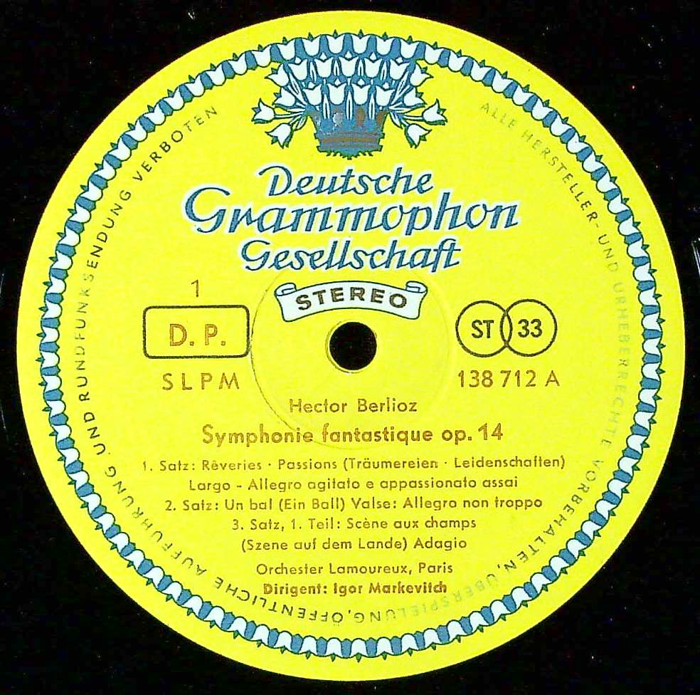 レーベルタイプ:【ドイツでのステレオ・第2版(フランス発売分の最初)】---チューリップALLE内溝, STEREO ○○ST33, 厚手(グルーヴガード厚手以前の厚手盤), 表記されたレコード番号:SLPM 138 712 , Price Code:なし, Rights Society:DP, Ⓟなし, スタンパー/マトリクス:138712-2 A/138712 B (ラウンド小文字スタンパー・DGG旧タイプ), DGGステレオを示す138***で始まりレコード番号を含む専用マトリクス使用, 補助マトリクス(Time Code):4 B1 HR S R/1 G1 HR S S , 再補助マトリクス:両面にMade in Germanyの刻印, カッティング担当:イニシャルHRはギュンター・ヘルマンス(Günter Hermanns)を示す, ラウンドで幅広レコード番号マトリクスなし, 1961年2月/1961年7月製造のスタンパーによる1963年頃製造分, フランス発売ではフラット盤はないと思われる(ドイツ発売にはあり・1961年分), 旧番号存在せず, フランス発売分でこれより古いステレオレーベル存在せず, フランス発売分では最古レーベル・最厚プレスと思われる, 更に古いマトリクス存在するか不明, モノラル存在する, RIAAカーヴである, DGG音源のDGG製作プレス, 工場:Hannover旧工場(Deutsche Grammophon Gesellschaft Pressing Plant Hannover・Werk I), ドイツ発売ではステレオ第2版だがフランス発売分ではオリジナルと思われる, 2nd issue for stereo