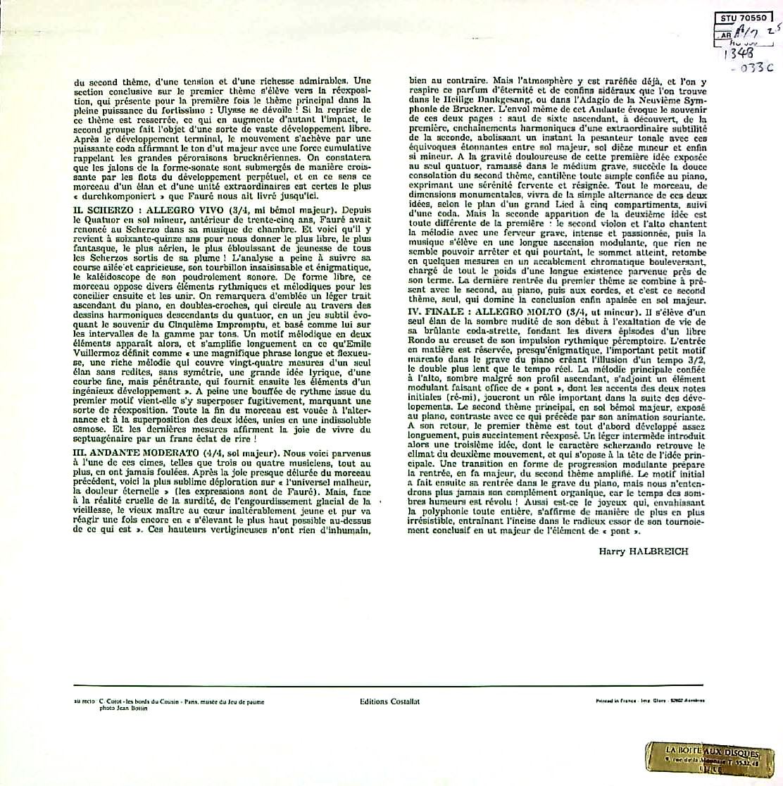 商品詳細:STU 70550-4の全5枚で、フォーレの室内楽を極めたERATOで初の室内楽全集録音。同じ頃、VSMでもコラール達によって同種の企画が進められたが、ユボー、ナヴァラが居るERATOの方が、よりフォーレらしい感覚を持っている。残念ながら全5枚揃えることは難しい。フォーレの室内楽は演奏が良ければ聴くほどに味わいが深まり、理解が進む曲である。今まで纏まった録音がなかったのが不思議。初出の紺白レーベルは近年では超が付く希少盤。1970年代とはいえこれまでERATOでさえ纏まった全集録音がないのが現状であった。この録音はパリ音楽院室内楽科教授のジャン・ユボーを中心にしたフランスの精鋭たちが録音、史上初となった全集である。ガブリエル・フォーレ( 1845 - 1924)の生誕125周年、没後45周年に当たり、それまで録音を待っていたのではないかと思われる。遅きに感じるがそれでもERATOというフランスを代表するレーベルが手掛けた室内楽全集録音は録音当時の最高ランクの演奏であることは間違いのない事実である。CALLIOPEのラヴェルの室内楽全集録音とともに1970年代の代表する傑作シリーズである。このシリーズ録音は仏ACCディスク大賞を受賞した。室内楽全集には様々な器楽奏者が必要となる為、1960年代まではキャストの効率を重視する意味で作曲家ごとの室内楽全集録音は殆ど企画されなかった。1970年代に入り、レコードの市場規模の拡大と市場の要請によりこのようなシリーズ企画が可能になった。そのような時代背景を理解すれば、録音時期に関しては理解されるだろう。1950-60年代の名手たちによる録音に越したことはないが、歴史とは傍観者の希望には応えてくれないものである。