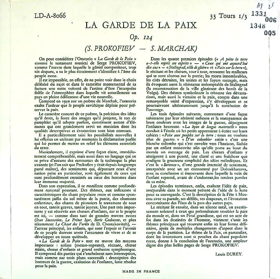 商品詳細:プロコフィエフ:オラトリオ「平和の守り」は晩年の1950年に病床で作曲されたオラトリオ作品。スターリン賞を得た。珍しい合唱作品で1918年のカンタータ『彼らは7人』、1939年のカンタータ『アレクサンドル・ネフスキー』Op.78以来の合唱曲となった。 オラトリオ「平和の守り」が録音されることは殆どなく、初めて目にする方が多いだろう。この最期の合唱曲は最も完成度が高く、プロコフィエフらしい不協和音が殆どなく平和をテーマにした曲である。二人のナレーターが度々登場しロシア語で俳優の様に言葉を挟む。不穏な空気感に包まれると今度は少年合唱が表れ、不思議な展開を見せる。難解な曲ではないが古典派のオラトリオとは一線を画する曲である。ロシア語の響きが効果を上げる曲なので、ロシア人指揮者以外の録音はあり得ない。大人の合唱団と少年合唱団があるべき場所で合唱を展開する。少年合唱の途中にボーイ・ソプラノのソロが加わり複雑な展開を見せる。大人の合唱団にはE.ドロハノワ(s)のソロも加わり、ソロ歌手と2つの合唱団、オーケストラが巧みに絡み合いながら複雑に展開していく。プロコフィエフの作曲センスの真骨頂が垣間見える素晴らしい晩年作品である。1950年10月19日モスクワの労働組合円柱の間でサムイル・サモスードの指揮で初演された。すぐ後に同様のメンバーで録音されたと思われる。1965年録音のG.ロジェストヴェンスキーの録音の入荷があったが、これはそれ以前の世界初録音である。MELODIYAのカタログにはない録音らしい。指揮者サムイル・サモスード(1884~1964)は生前のプロコフィエフが最も信頼し、懇意にしていた名指揮者である。サモスードはプロコフィエフのマイナーな管弦楽、声楽作品をWestminster、Monito等に録音している。全て旧ソ連での録音だがそれらが何故かMELODIYAからは未発売である。この「平和の守り」もそれらと同じ録音らしい。サモスードはプロコフィエフ演奏のスペシャリストである。1950年度のスターリン賞第2席を受賞している。作詞はロシア詩人サムイル・マルシャーク(1887-1964)「森は生きている」などで知られる。全10楽章。これらの曲は翻訳版では意味をなさない。サモスード盤かG.ロジェストヴェンスキー盤か選択は2択と思われる。