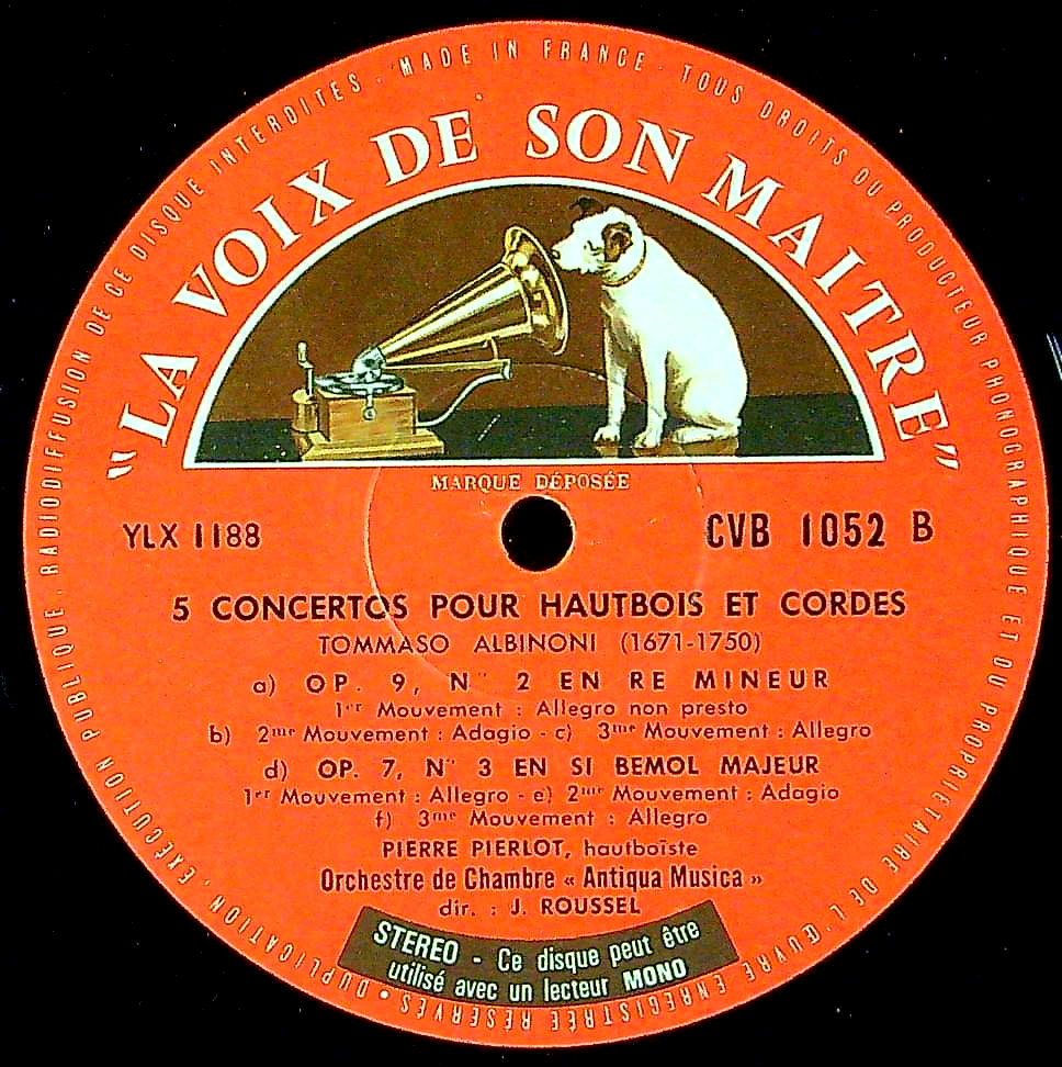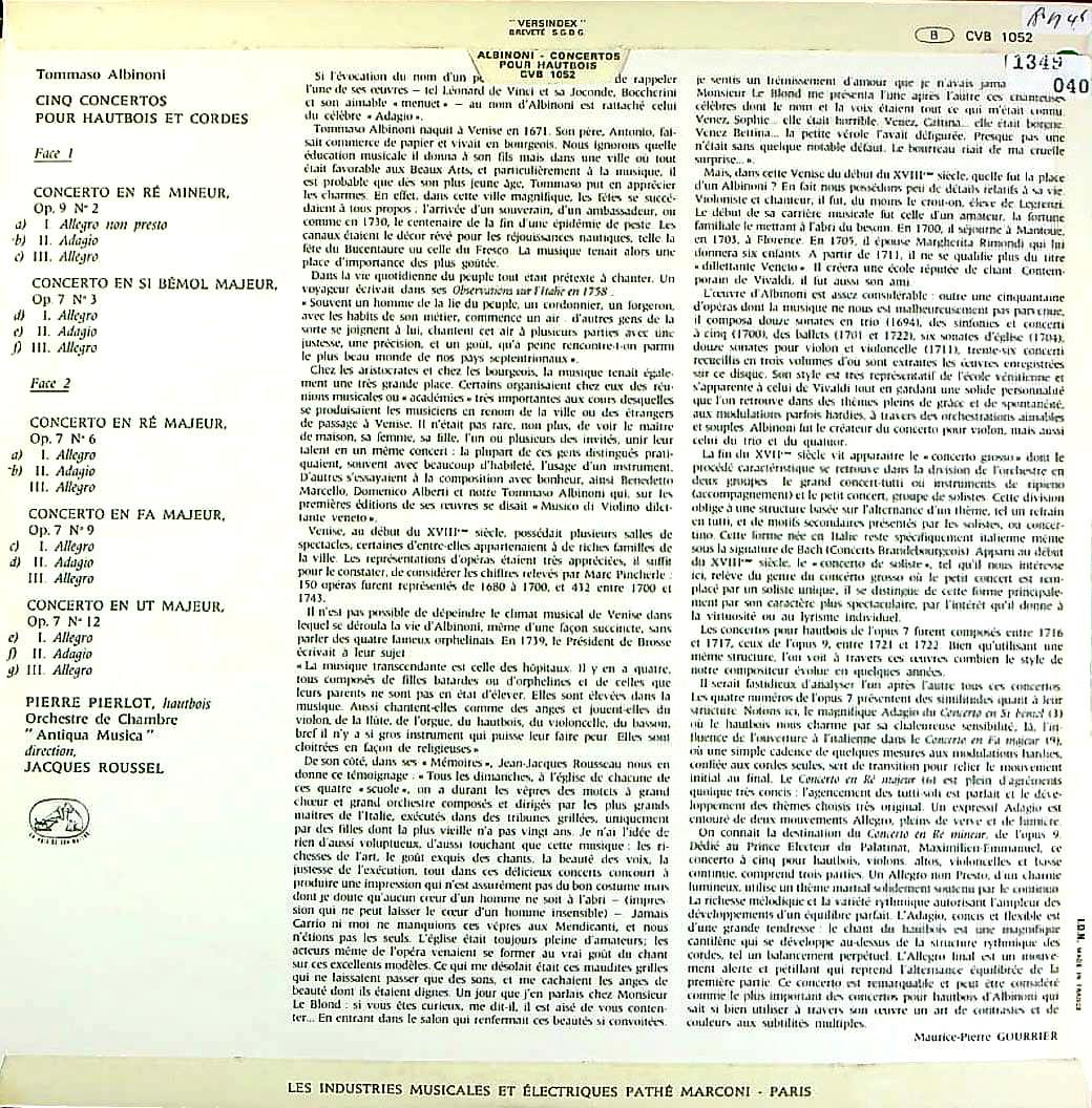 商品詳細:アルビノーニのOp.7は合奏協奏曲、オーボエ協奏曲、2つのオーボエのための協奏曲等による全12曲の5声の協奏曲集。このLPでは全12曲~オーボエ協奏曲の4曲とやはり全12曲の5声の協奏曲集であるOp.9~オーボエ協奏曲を1曲選んで全5曲入りのオーボエ協奏曲集とした、ピエール・ピエルロをソリストとしたLPである。オケはジャック・ルーセル指揮アンティカ・ムジカ室内o.による。このオケは1961年ジャック・ルーセルがパリで創設した室内オーケストラである。指揮者のジャック・ルーセル(1911 -2008)はパリ生まれの指揮者。作曲家のアルベール・ルーセルとは特に血縁はないようである。1960年代にLa Voix De Son Maître、PHILIPS、FYなどに多少の録音を残しているものの、あまり著名とは言えない指揮者である。これまで入荷したLPの内容はどれもバロック作品ばかりである。1960年代のパリにはアンティカ・ムジカ室内o.のような室内オーケストラが乱立した時代であり、余程の名声がない限り有名になることはなかった。このようにメジャー・レーベルに録音を残しているだけでも栄誉なことである。ソリストであるピエール・ピエルロの引き立て役となっているが、その実力は申し分なく、1960年代中期という時期にしっかり時代考証がなされたモダン楽器によるバロック演奏が整っている。内容としてはピエール・ピエルロのアルビニーノ:Ob協奏曲集である。ピエール・ピエルロ( 1921- 2007)はパリの生まれのフランスを代表するオーボエ奏者である。1946年からジャン=ピエール・ランパル、ジャック・ランスロ、ポール・オンニュ、ジルベール・クルシエと木管五重奏団を結成して演奏活動を開始し、翌年にはパリのオペラ=コミック座に首席オーボエ奏者として加わった。1969年から1986年までパリ音楽院で教鞭をとった。その前から主にパリ・バロック・アンサンブルの一員として頻繁に来日、読売日本交響楽団(若杉弘指揮)とモーツァルトの協奏曲も演奏した。1960年代から1990年代まで日本で数多くの演奏会に出演した。録音も1950年代から多岐にわたる。