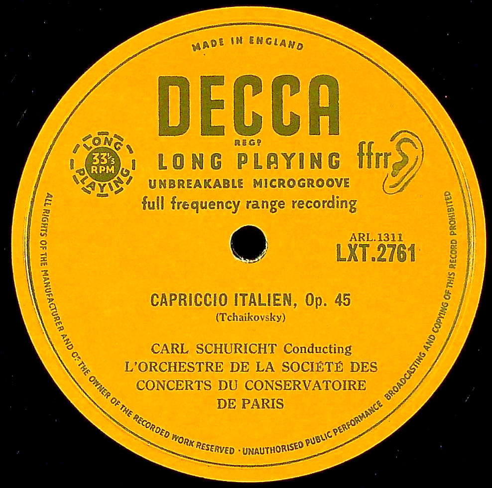 商品詳細:LW 5274で組曲3番~ 「主題と変奏」の1曲入り10インチ盤もあるがそれは1956年頃のリリースで、1953年発売のイタリア奇想曲とカップリングされたこの12インチ盤が初出と思われる。珍しいDECCA録音の一つ。音は想像を遥かに超える素晴らしさ。あとから入れたイタリア奇想曲は、耳をつんざく程の力を持った演奏。10"を切り直した組曲は、それに比べ、やや弱いが、'50年代初期とすれば、相当なレベルだ。チャイコフスキーと言えども、シューリヒト/パリがやれば、こうなるという見本のような録音。演奏が良いと、曲まで存在感が変わってくる。C.シューリヒト指揮パリ音楽院o.というベートーヴェン交響曲全集と同じ黄金のカップルでチャイコフスキーの管弦楽2曲が最高ランクの演奏で収録されたDECCA盤!モノラル録音オーディオファイルLP!C.シューリヒト指揮パリ音楽院o.のチャイコフスキーは唯一と思われる。組曲3番の全曲録音は存在しない。