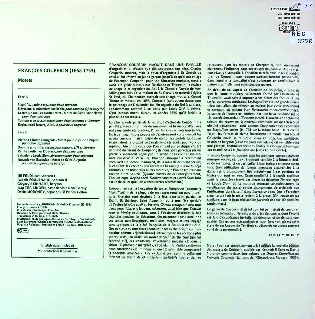 商品コード:REG-3776[仏HM] L.フェルトマン, I.プールナール(s) G.ラインハルト(br) 他/ モテット集/F.クープラン:マニフィカト 他 (全9曲)