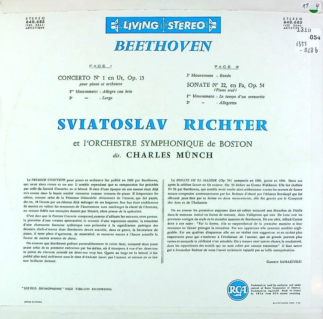 商品コード:1351-028b[RCA] S.リヒテル(pf)/ ベートーヴェン:Pf協奏曲1番, Pfソナタ22番
