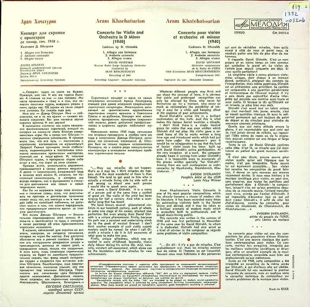 商品コード:1352-032nb[MELODIYA] D.オイストラフ(vn) A.ハチャトゥリアン/ ハチャトゥリアン:Vn協奏曲