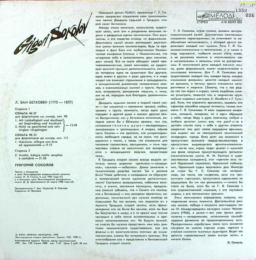 商品コード:1352-026n[MELODIYA] G.ソコロフ(pf) / ベートーヴェン:Pfソナタ27番, 32番