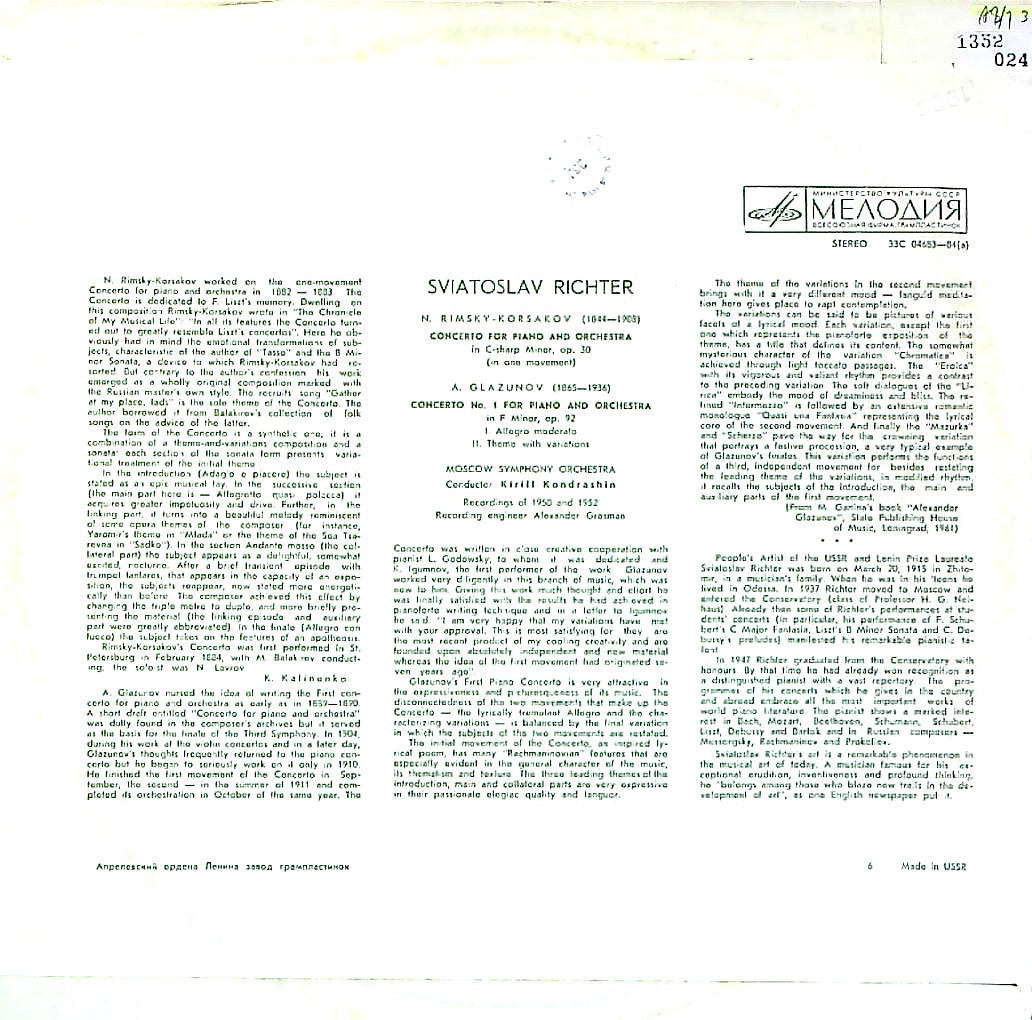 商品コード:1352-024n[MELODIYA] S.リヒテル(pf)/ Pf協奏曲/リムスキー・コルサコフ, グラズノフ:1番