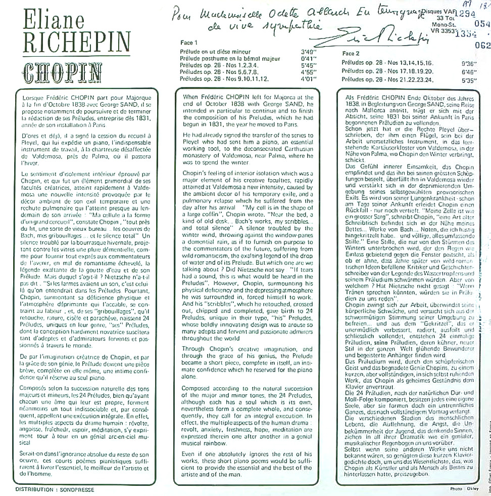 商品詳細:エリアーヌ・リシュパン(1910 – 1999)はパリ国立高等音楽院で音楽を学び、マルグリット・ロン、アルフレッド・コルトーとイヴ・ナットにピアノを、ポール・フォーシェとノエル・ギャロンにハーモニー、フーガと対位法、アンリ・ビュッサールに作曲を師事。1943年コンセール・パドルーと共演しデビューした。オーケストラとの1.200回以上のリサイタルと700回のコンサートを行った。彼女はパリ大学ミュージカル国際大学の設立に関わり、後進の育成に力を注いだ。ロン・ティボー国際コンクール他、多くの国際コンクールで審査員を務めた。録音は少なく、ショパン作品集が2点で全てと思われる。明確なタッチと豊かな情感を伴ったフレンチピアニズムの一人である。レコード市場では無名だがその2枚の価値は大きい。この前奏曲集こそリシュパンを知る重要な1枚。1973年頃の録音と思われるが演奏、音質とも申し分なく良い。Op.28の24曲に加えOp.45と遺作の全26曲を収録。単に全曲録音しましたというLPが多い中で、この単調になりがちな前奏曲集をここまで鮮やかに聴かせるピアニストは多くない。ピアノ好きには非常に興味をそそる1枚だろう。腕前は超一流!もう1枚はショパン・バラード集。REM:10983