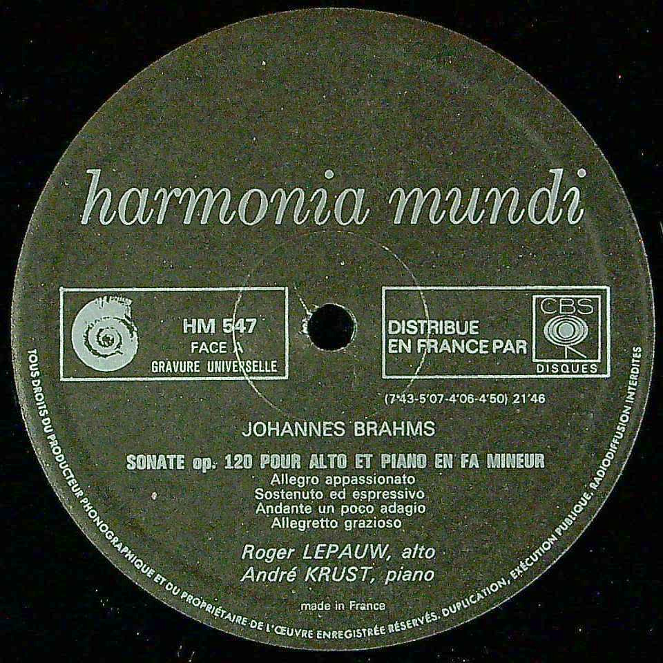 商品詳細:非常に珍しいHarmonia Mundiのオリジナル録音。1964年頃モノラル/ステレオでリリースされた。ドイツ側でもリリースされたと思われが間違いなくフランス録音と思われる。ヴィオラ奏者ロジェ・ルポーは生れ年不明のヴィオラ奏者。世にヴァイオのソリストだけで活動できるヴァイオ奏者はいない。それだけヴィオラがソロをとれる曲がないからである。ルポーはこれまでのチッコリーニとモーツァルトのK.498で共演しており、パリ管弦楽団弦楽四重奏団(Quatuor À Cordes De L'Orchestre De Paris)のメンバーとして共演している。クラリネットのアンリ・ドリュアールとK.581やブラームスのクラリネット五重奏曲Op.115等の録音もあった。またそれ以前にLe Quatuor N.D.M.という聴いた事のない弦楽四重奏団にも所属していた。この団体は幸松肇 氏の「世界の弦楽四重奏団とそのレコード」にも掲載されていないマイナーな団体でN.D.M.の意味は不明だがメンバーは解かっている。 Michel Ganot,/Robert Gendre/Roger Lepauw/Robert Bexの4人。チェロのRobert Bexは良く知られたソリストで多くの録音を出している。元々パリ国立歌劇場o.の首席チェロ奏者であった。N.D.M.弦楽四重奏団の詳細は全く不明。その団体のヴィオラ奏者であるロジェ・ルポーがソリストとしてブラームスのVaソナタを録音という快挙である。しかし母体であるN.D.M.弦楽四重奏団やパリ管弦楽団弦楽四重奏団があまり知られていないのは釈然としない。ブラーム晩年の傑作として、クラリネットでの演奏も多い、2つのソナタ。聴いてみると、ルポーのソロはまるでヴァイオリン奏者のように実に明快に旋律を刻むはっきりとした豊かな音を出している。所謂前に出る音である。ヴァイオリンより旋律を奏でることが不利になるヴィオラだが、ここまでくっきりとした音で演奏されたヴィオラ・ソナタは思い浮かばない。重音奏法も取り入れ、なかなか聴かせる演奏である。クラリネット演奏も良いが、ヴィオラ版ならばこの録音は是非お勧めしたい。1960年代中期以前の良い時期であり、音も腰の座った低い音が出ている。