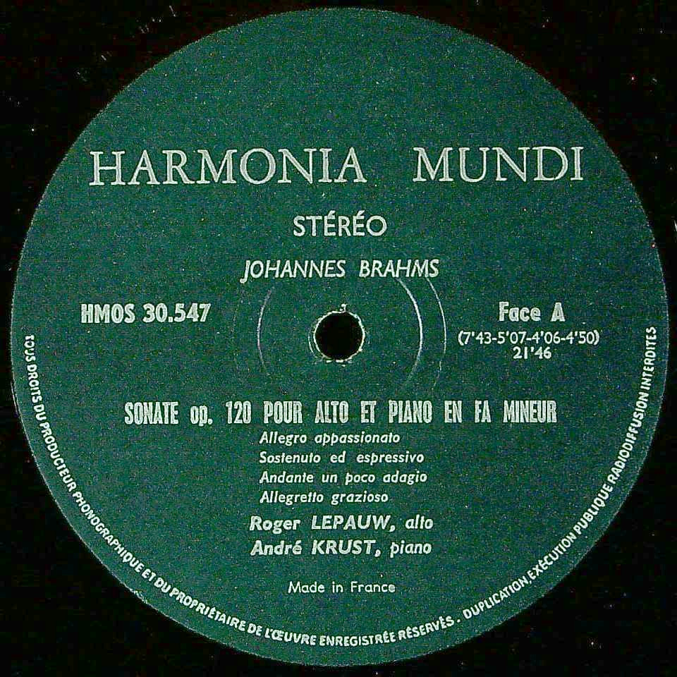 商品詳細:非常に珍しいHarmonia Mundiのオリジナル録音。1964年頃モノラル/ステレオでリリースされた。ドイツ側でもリリースされたと思われが間違いなくフランス録音と思われる。ヴィオラ奏者ロジェ・ルポーは生れ年不明のヴィオラ奏者。世にヴァイオのソリストだけで活動できるヴァイオ奏者はいない。それだけヴィオラがソロをとれる曲がないからである。ルポーはこれまでのチッコリーニとモーツァルトのK.498で共演しており、パリ管弦楽団弦楽四重奏団(Quatuor À Cordes De L'Orchestre De Paris)のメンバーとして共演している。クラリネットのアンリ・ドリュアールとK.581やブラームスのクラリネット五重奏曲Op.115等の録音もあった。またそれ以前にLe Quatuor N.D.M.という聴いた事のない弦楽四重奏団にも所属していた。この団体は幸松肇 氏の「世界の弦楽四重奏団とそのレコード」にも掲載されていないマイナーな団体でN.D.M.の意味は不明だがメンバーは解かっている。 Michel Ganot,/Robert Gendre/Roger Lepauw/Robert Bexの4人。チェロのRobert Bexは良く知られたソリストで多くの録音を出している。元々パリ国立歌劇場o.の首席チェロ奏者であった。N.D.M.弦楽四重奏団の詳細は全く不明。その団体のヴィオラ奏者であるロジェ・ルポーがソリストとしてブラームスのVaソナタを録音という快挙である。しかし母体であるN.D.M.弦楽四重奏団やパリ管弦楽団弦楽四重奏団があまり知られていないのは釈然としない。ブラーム晩年の傑作として、クラリネットでの演奏も多い、2つのソナタ。聴いてみると、ルポーのソロはまるでヴァイオリン奏者のように実に明快に旋律を刻むはっきりとした豊かな音を出している。所謂前に出る音である。ヴァイオリンより旋律を奏でることが不利になるヴィオラだが、ここまでくっきりとした音で演奏されたヴィオラ・ソナタは思い浮かばない。重音奏法も取り入れ、なかなか聴かせる演奏である。クラリネット演奏も良いが、ヴィオラ版ならばこの録音は是非お勧めしたい。1960年代中期以前の良い時期であり、音も腰の座った低い音が出ている。