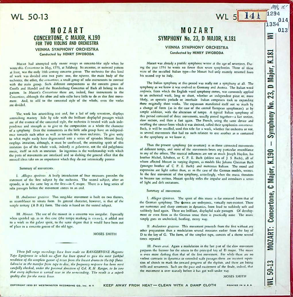 商品コード:1354-013[WESTMINSTER] H.スヴォボダ/ モーツァルト:コンチェルトーネK.190, 交響曲23番K.181