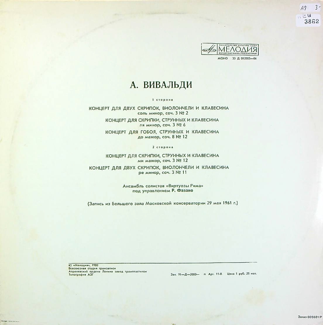 商品コード:REG-3862[露MELODIYA] R.ファザーノ/ 「ヴィヴァルディ:協奏曲集」