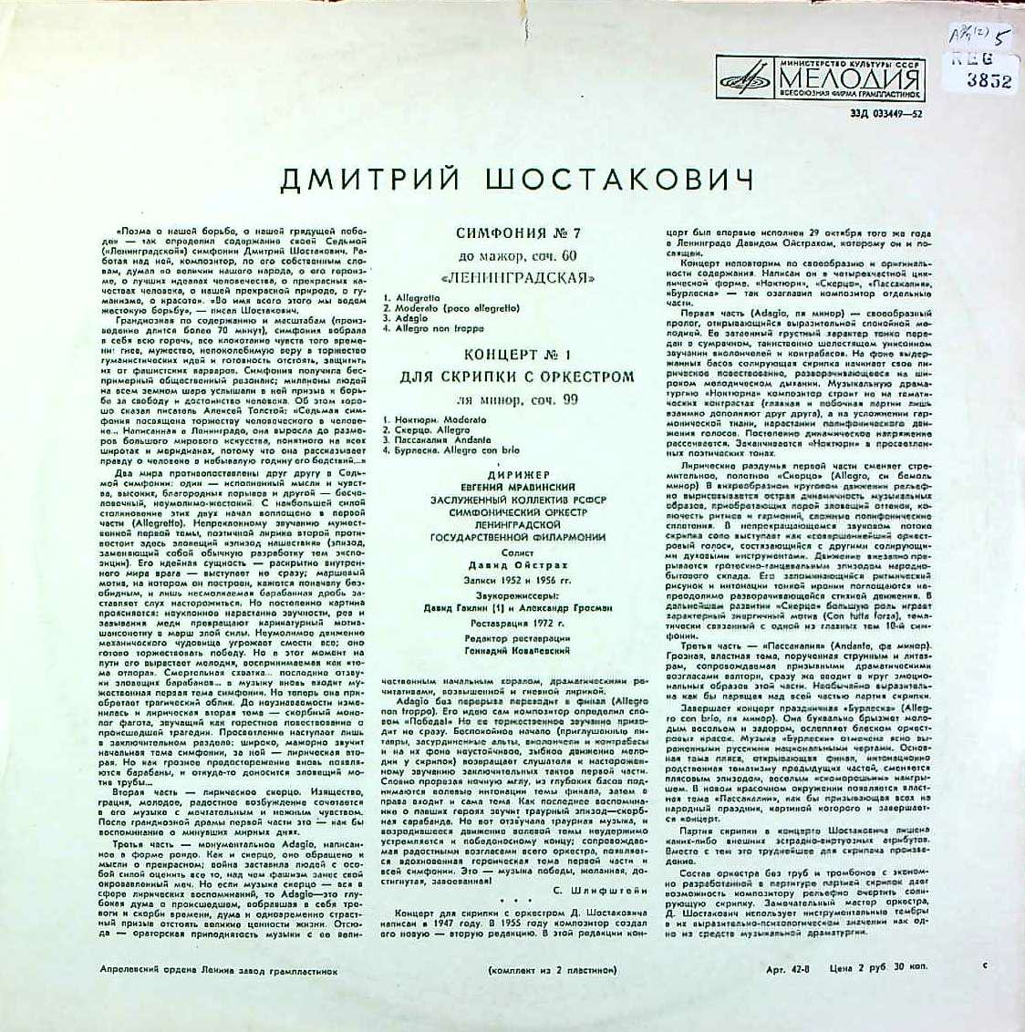 商品コード:REG-3852[露MELODIYA] D.オイストラフ(vn) E.ムラヴィンスキー/ ショスタコーヴィチ:交響曲7番「レニングラード」, Vn協奏曲1番