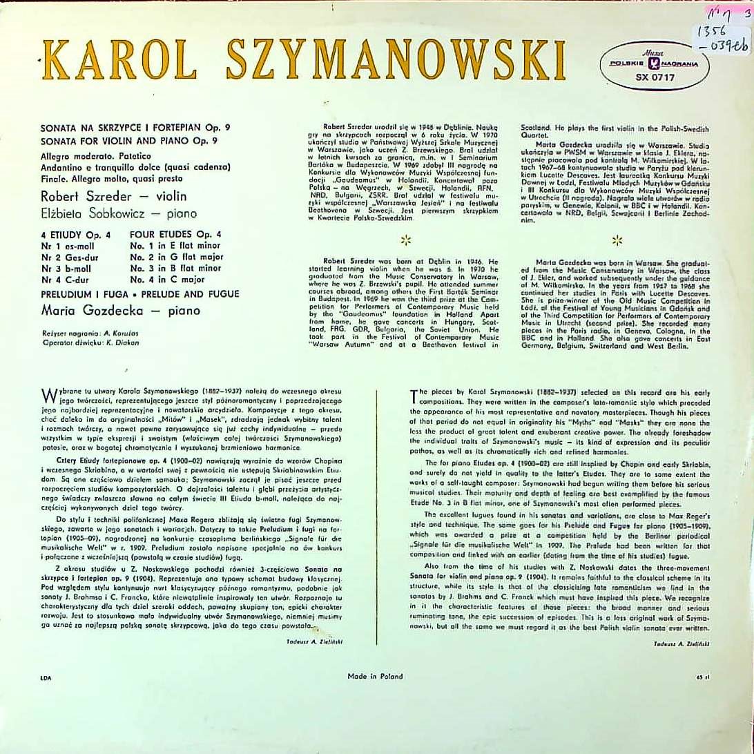 商品詳細:オランダで行われていた演奏コンクールである「ガウデアムス国際現代音楽演奏コンクール」におけるポーランド人入賞者によるシマノフスキの演奏を集めたLPである。このコンクールは1963年以来毎年行われていたが、年号の記載が無く何年の録音であるかは不明。ヴァイオリン奏者のロバート・シュレーダー(1946-)はポーランド・デンブリン生まれ。フレデリック・ショパン音楽大学でゼノン・ブレフスキ教授に師事した。1970年ワルシャワ音楽院を卒業している。1969年「ガウデアムス国際現代音楽演奏コンクール」で国際演奏家賞を受賞した。シュレダーは、ポーランド文化功労勲章とポーランド復興勲章の士官十字章 を授与されている。コンクールの後1974年にオランダに移住し、マーストリヒト音楽アカデミーのヴァイオリン教師でもあり、客員講師として働き、世界中でマスタークラスを行っている。1996 年から 2015 年まで、ロバート・シュレーダー奨学金財団の会長を務め、2015 年からはロバート・シュレーダー若手音楽家マネジメントのディレクターを務めている。ピアノのマルタ・ゴズデカは生まれ年不明のポーランド・ワルシャワ生まれの女性ピアニスト。ワルシャワ音楽院を卒業している。Mウィルコミルスカに師事。1968年パリに留学し、ルセット・デカーヴにも師事している。ゴズデカもまたオランダのユトレヒトで開かれた現代音楽コンクールで準優勝した。その後欧州各地で演奏会を行っている。シュレーダーはA面でシマノフスキのVnソナタ ニ短調Op.9をE.ソブコヴィツ(pf)の伴奏で録音。クルカに似た透明度の高い音色を持つクールな弦の音持つ。ほとんど演奏されない1904年作のVnソナタを披露。リヒャルト・シュトラウスやブラームスの影響を感じさせる作風で知られる。B面はマルタ・ゴズデカのピアのソロ作品2つが録音されている。4つの練習曲は1902年の作品。第3曲目 変ロ短調は、パデレフスキが「この若さで" 第9 "を作曲してしまうとは、何と不幸なことか!」と絶賛し愛奏したことで、シマノフスキのピアノ曲中最も有名な作品となっている。こちらの録音も殆どない。ロマンチックな作品である。何方も珍しいシマノフスキ作品でMUZA以外での録音は殆どない。愉しめる1枚。