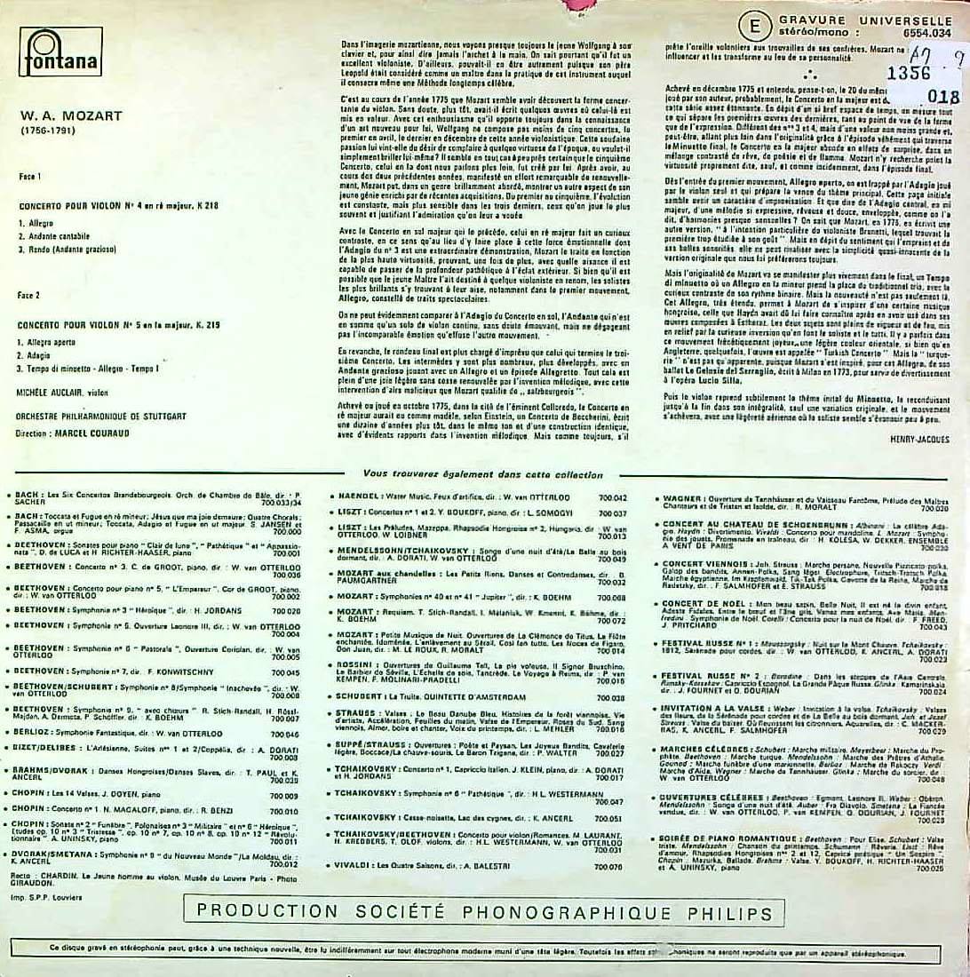 商品コード:1356-018[FONTANA] M.オークレール(vn)/ モーツァルト:Vn協奏曲4番K.218, 5番K.219