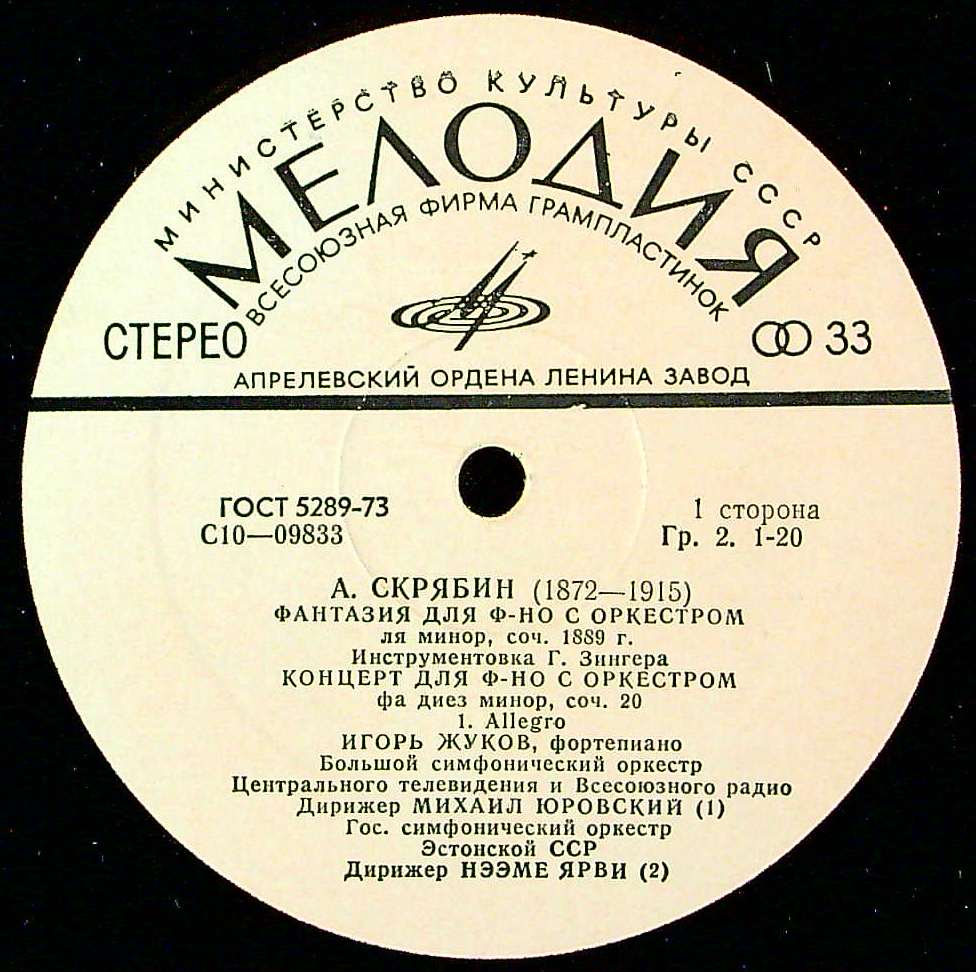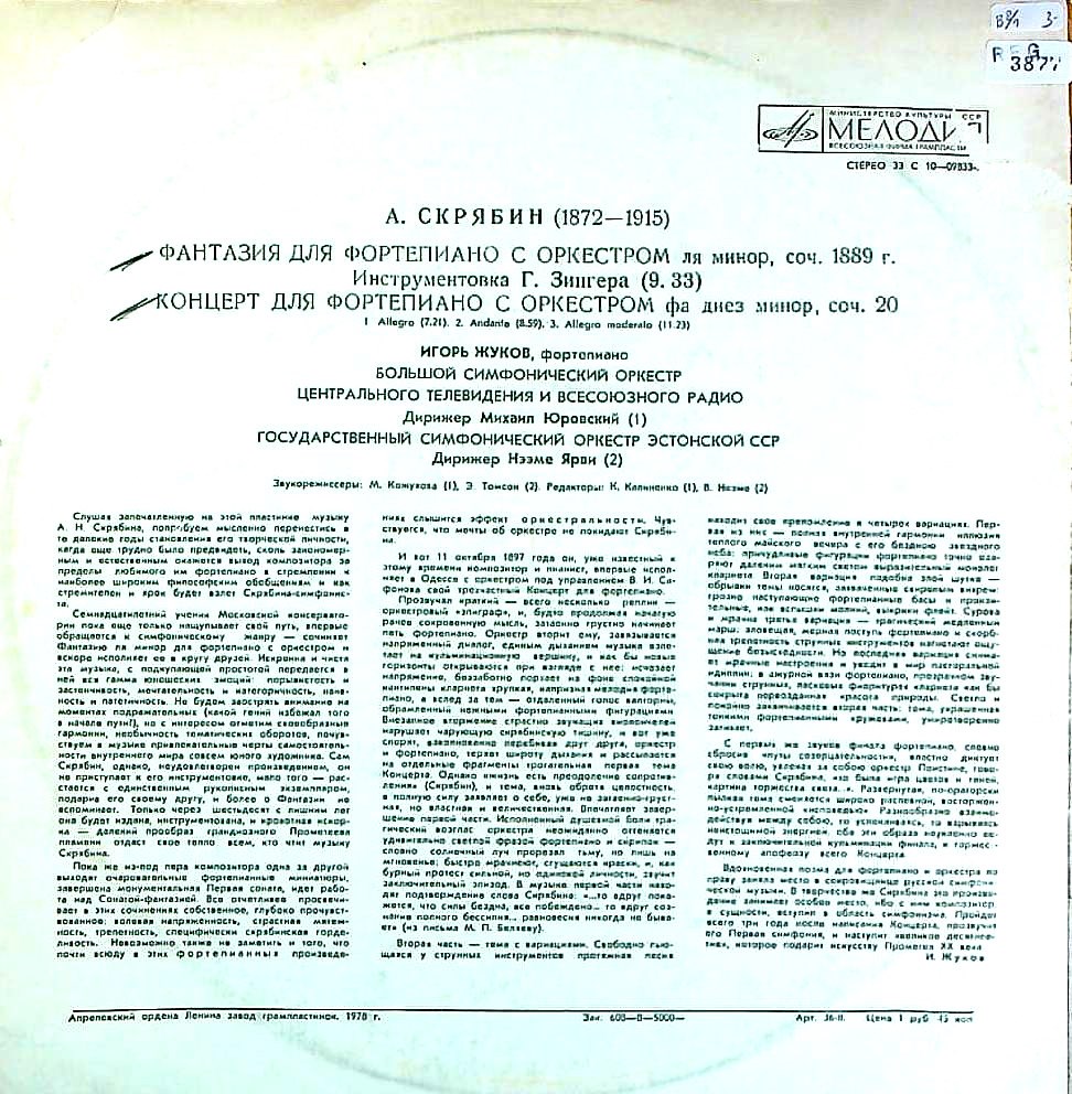 商品コード:REG-3877[露MELODIYA] I.ジューコフ(pf)/ スクリャービン:Pfと管弦楽のための幻想曲, Pf協奏曲