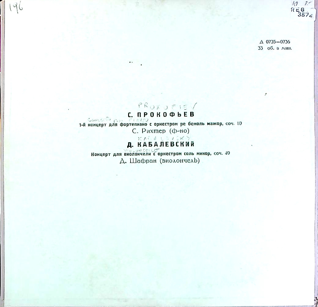 商品コード:REG-3872[露MELODIYA] S.リヒテル(pf)/D.シャフラン(vc)/ プロコフィエフ:Pf協奏曲1番, カバレフスキー:Vc協奏曲1番