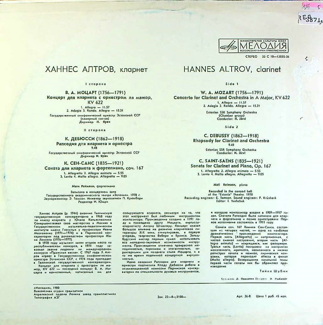 商品コード:REG-3871t[露MELODIYA] H.アルトロフ(cl)/ 「ハンネス・アルトロフ・Cl演奏集」モーツァルト, ドビュッシー, サン・サーンス