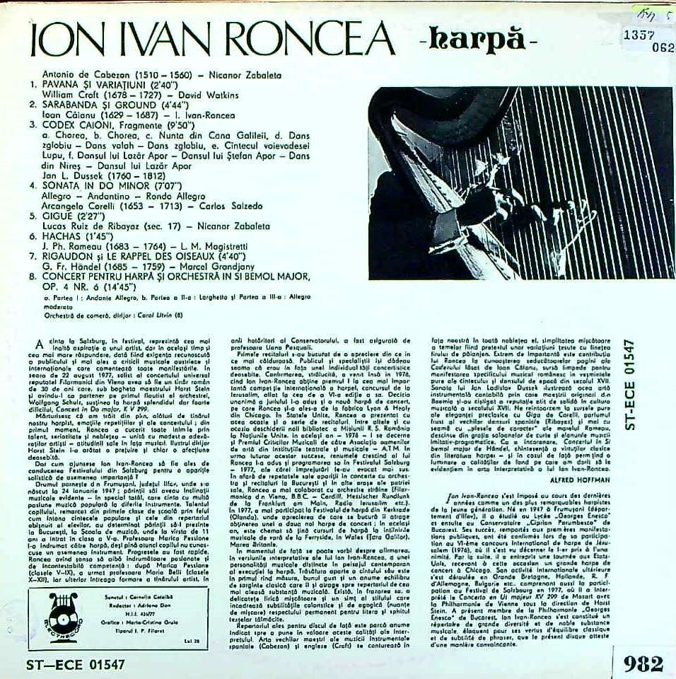 商品詳細:イオン・イヴァン・ロンセア(1947-)はルーマニア生まれの男性ハープ奏者。ブカレスト国立音楽大学を卒業し、そこでリアナ・パスクアリに師事。1977年と1979年にはニューヨークでパール・チェルトク教授に師事した。1976年イスラエル第6回国際ハープコンテストで優勝した。1978年Electrecordから初のリサイタル盤をリリースした。ロンセアはブカレスト・ジョルジュ・エネスク・フィルハーモニー管弦楽団のソリストであり、ブカレスト国立音楽大学のハープ教授である。国内のすべてのフィルハーモニー管弦楽団と共演し、数多くのリサイタルを開催。東京の松尾ホールでも公演を行った。彼は世界ハープ会議にゲストアーティストおよび教授として何度も招待されており、1985年から1990年にかけては世界ハープ会議の理事会のメンバーを務めた。現役のハープ演奏者では最古参に入る。当LPは1978年頃の初リリースで古くはないが、ルーマニア盤において世代は音質とあまり相関関係が無く気にする必要はない。ルーマニアでは珍しいハープ録音として愉しめる1枚。滅多に出てこない盤だけに希少である。1982年頃モーツァルト:FlとHpのための協奏曲K.299も録音している。当リサイタル盤は入荷の僅かな1枚。演奏、音質ともに第一級!、一音一音を丁寧に扱っている。カベソン、クロフトというルネサンス時代の作品の演奏は、バード/ギボンズを弾いたグールドのハープ版を連想させる。ルーマニアのプレスであるが盤質が良く、サーフェイス・ノイズも非常に少ない。特筆すべきは録音の優秀さである!