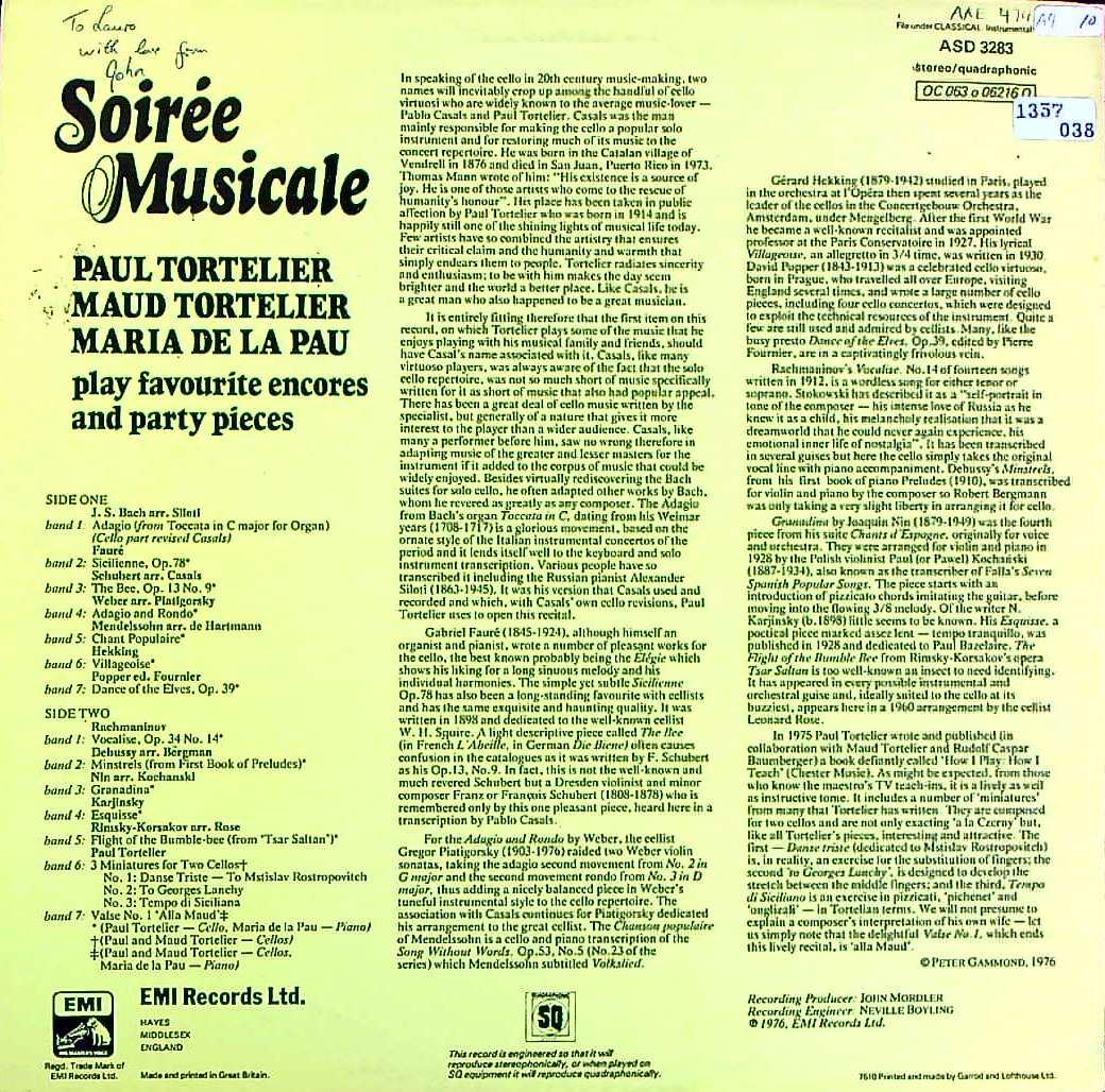 商品コード:1357-038[HMV] P.トルトゥリエ, M.トルトゥリエ(vc)/ Vc小品集/バッハ, フォーレ, シューベルト, ウェーバー 他
