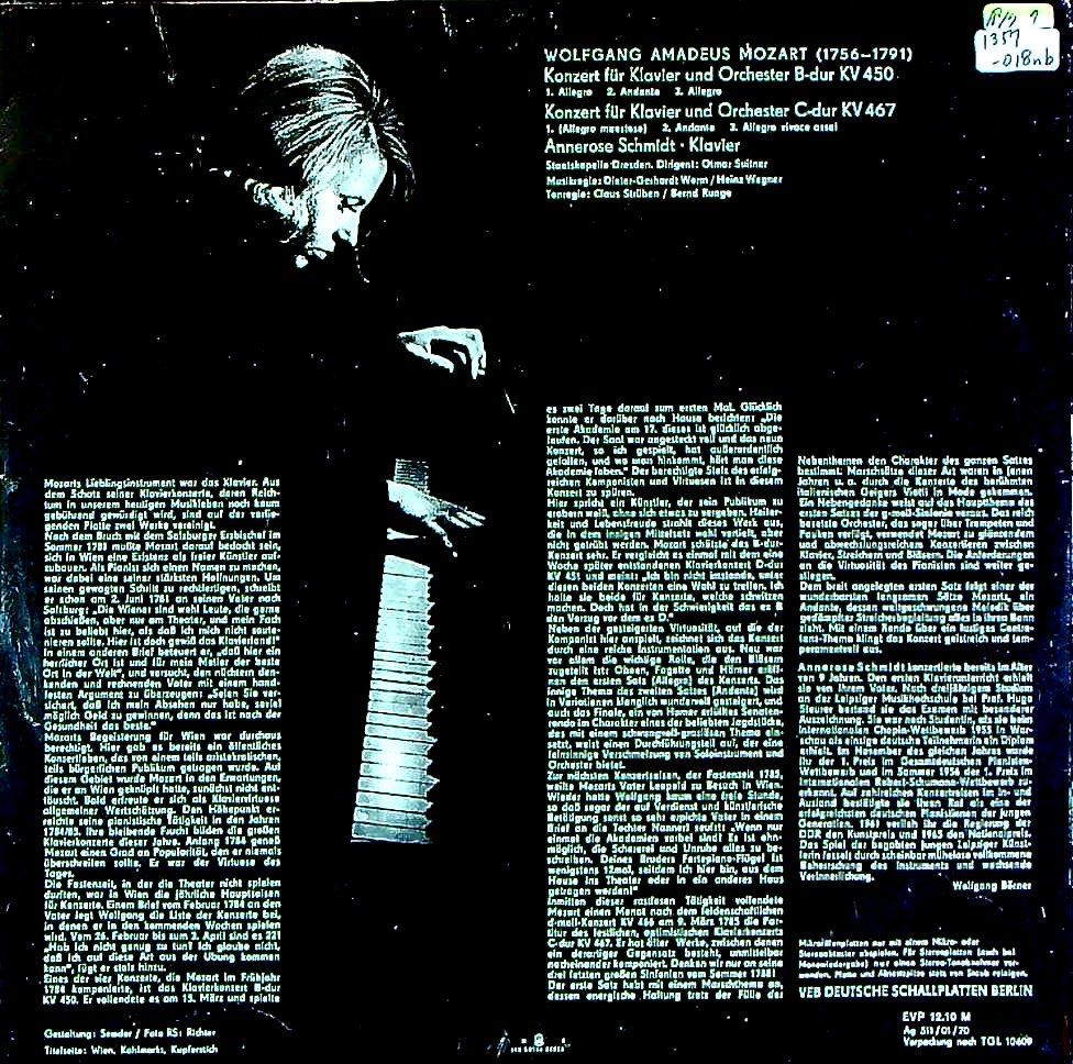 商品詳細:A.シュミットは'70年代に入ってマズアとの全曲録音を果たしたが、この2曲はそれ以前にスウィトナーと入れた全て。15番のみ10"のモノラルが初出。ETERNAはモノラルが出たあと10年程経って初めてステレオが出るケースが多く、擬似ステレオではない(ステレオプレスの技術が西側より約10年遅れた為)。正直言って、シュミットのソロは2回目より抜群に良い。それぞれ、シュトリューベン、ルンゲの録音。みずみずしく、美しい理想的なモーツァルト!! 825 464はV字ステレオが同一番号で存在するが滅多にない高額盤で黒厚盤なら十分満足いただける音質である!但しモノラル820 464は別格!アンネローゼ・シュミット(1936-2022)はアンネローゼ・ベック で、ドイツ、ルターシュタット・ヴィッテンベルク出身の美形の女性ピアニスト。父がヴィッテンベルク音楽院の院長であった為、英才教育を受け、幼少時の1945年9歳で正式にデビューした。1955年ライプツィヒ音楽院を卒業。1956年の国際ロベルト・シューマン・コンクールで優勝した。その為ETERNAのシューマンEDにも参加している。1987年ハンス・アイスラー音楽大学ベルリン教授及びピアノ学科学部長に就任。1990年にはそのまま学長となった。2000年からはショパン国際ピアノ・コンクール評議員を務めた。2006年にコンサート・ピアニストを引退。2022年に亡くなった。日本へは1973年から数回訪れている。1977年の来日では東京文化会館でブラームスのピアノ協奏曲第2番をグシュルヴァウアー指揮/読売日本交響楽団と披露した。当初よりモーツァルト弾きとしてモノラルでソナタ録音などもあったが、ETERNAに一人で複数台Pf用とチェンバロなどで演奏される初期番号は除く、5番以降の17曲の協奏曲とロンド2曲をクルト・マズアと共に録音したことは永久に記憶されるであろう。しかしその前に1963年スウィトナーと入れた2曲を超えることはできなかった。それでも東独に17のモーツァルト協奏曲を残した実績は大きいと言わざるを得ない。彼女の音は清潔且つ端正。情感タップリではなく楽譜に奉仕するタイプである。自分を出さず曲に寄り添う。従ってフランス系の1950-60年代に活躍したスタイルと比べると物足りなさが残る。しかし少し物足りないくらいが繰り返し聴くには必要な条件である。コンヴィチュニーのベートーヴェンと同様ETERNAにある美学だろう。これは、マズアとの全集録音よりも前の1964年初リリースのスウィトナーとの単独録音。